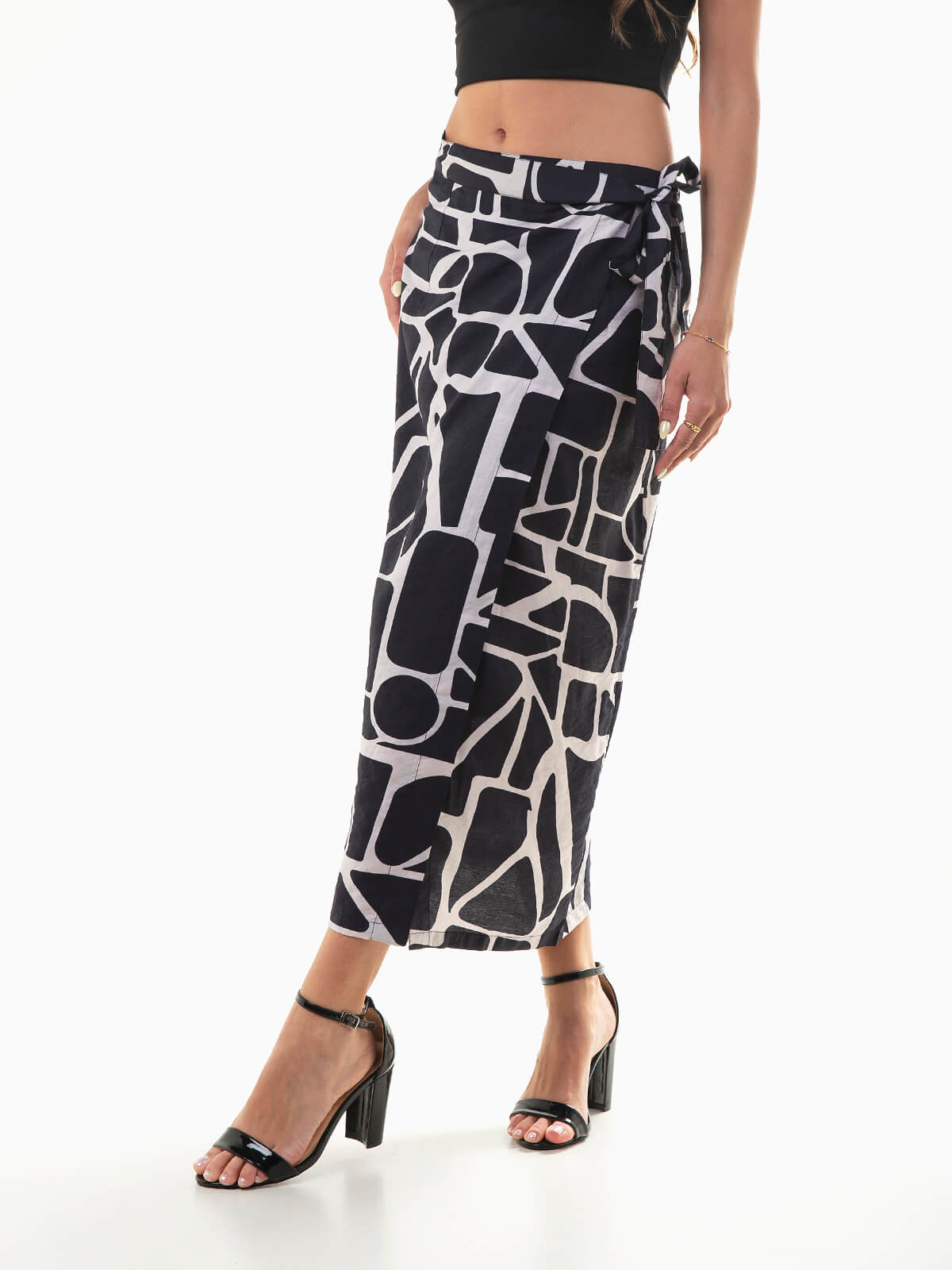 Saia midi preta com estampado geométrico em contraste. Saia de trespasse com aperto de botão e tecido para laço.