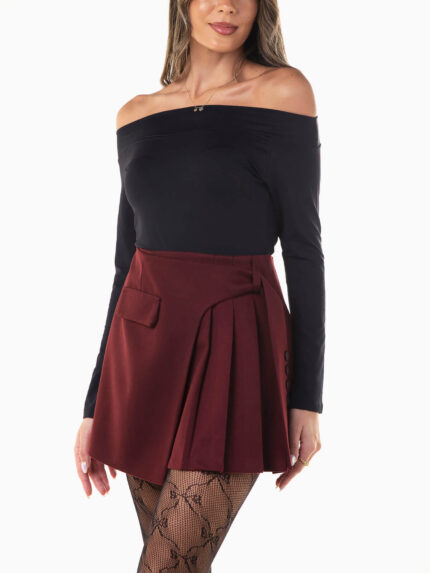 Saia midi preta com efeito pele para senhora. Saia cintura alta com abertura na base. Aperto fecho éclair e botão.