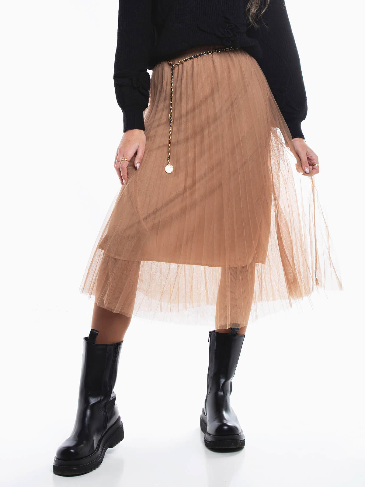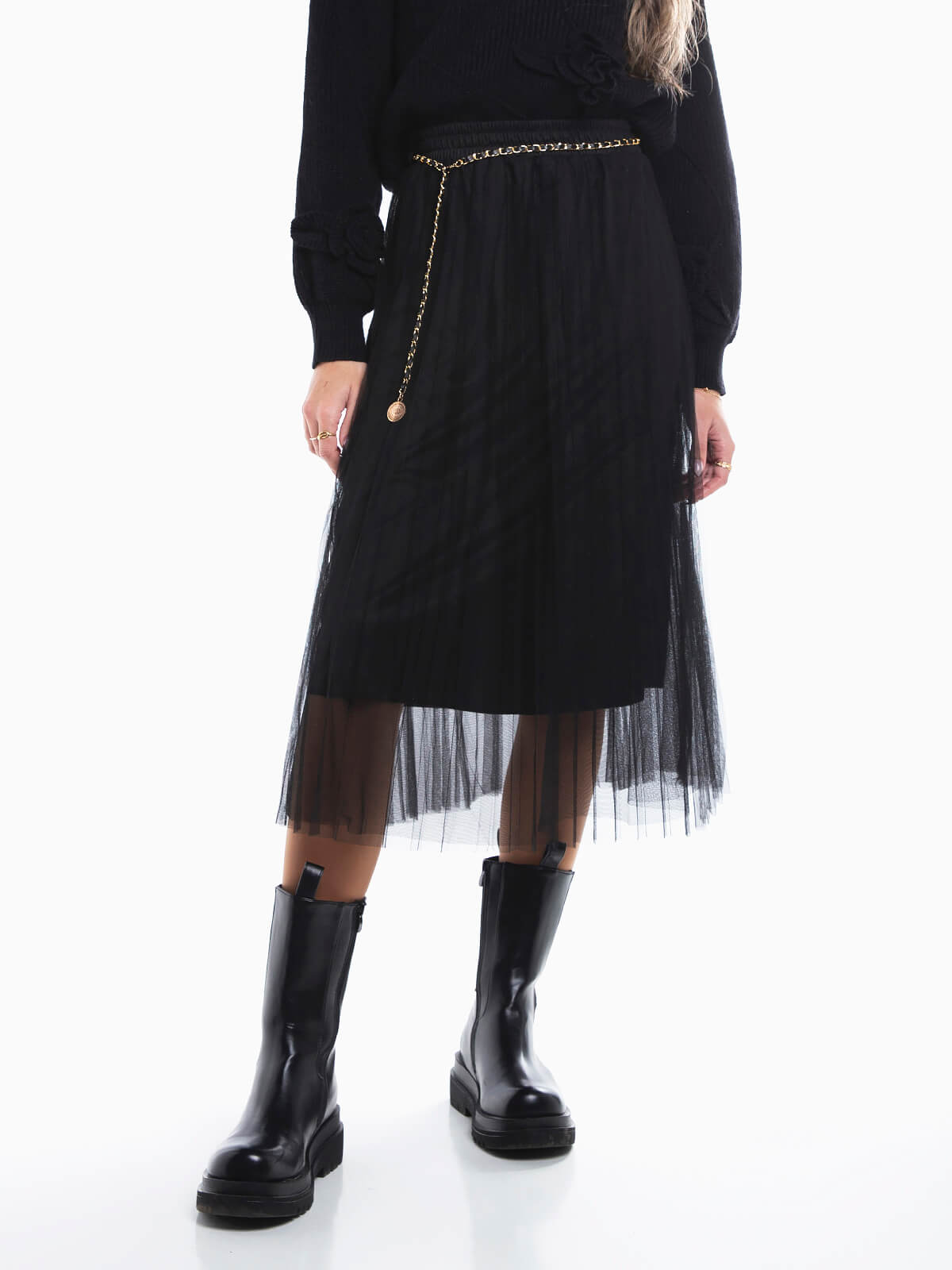 Saia midi de tule com corrente dourada removível. Saia plissada de cintura alta elástica com forro.
