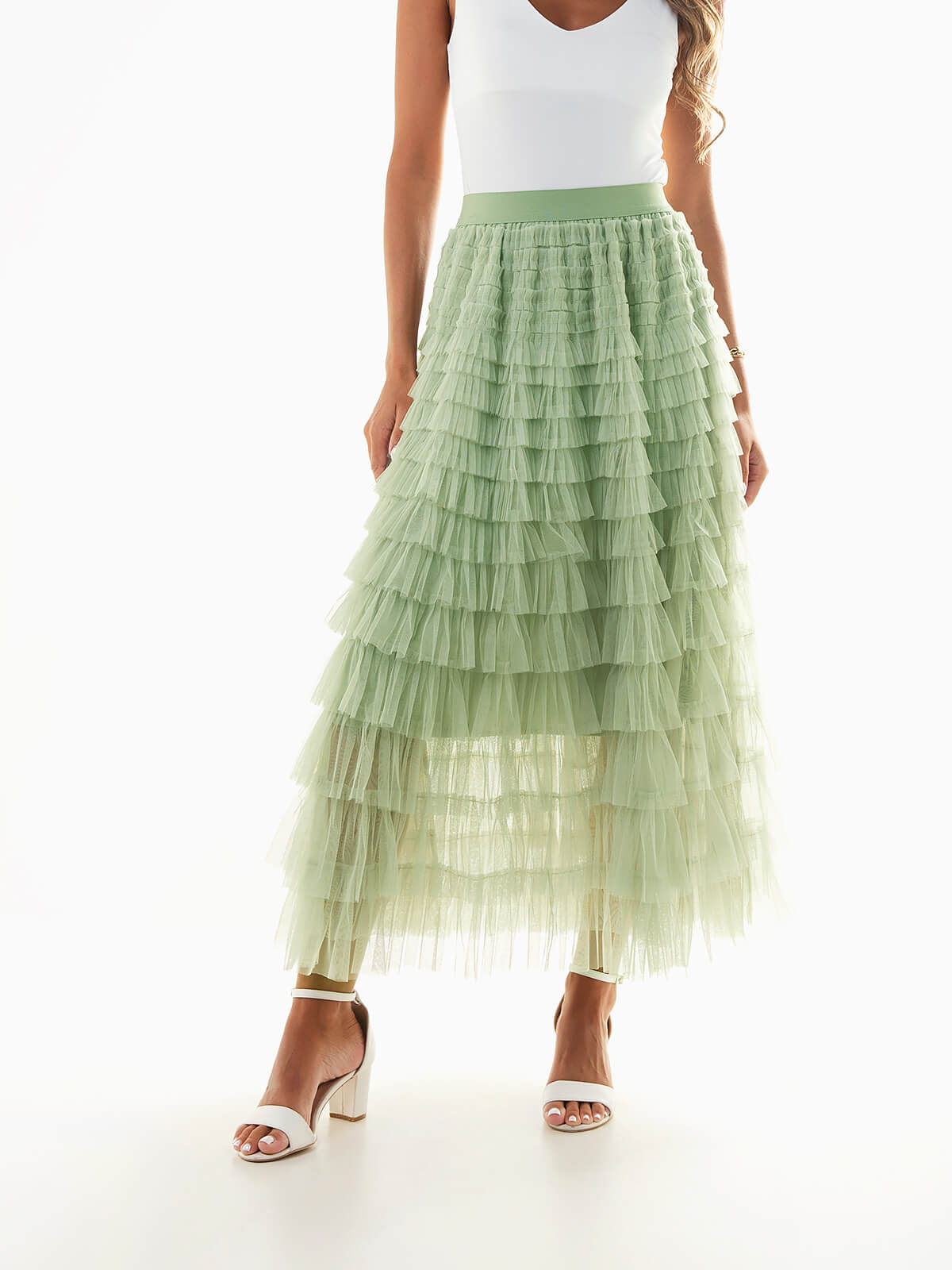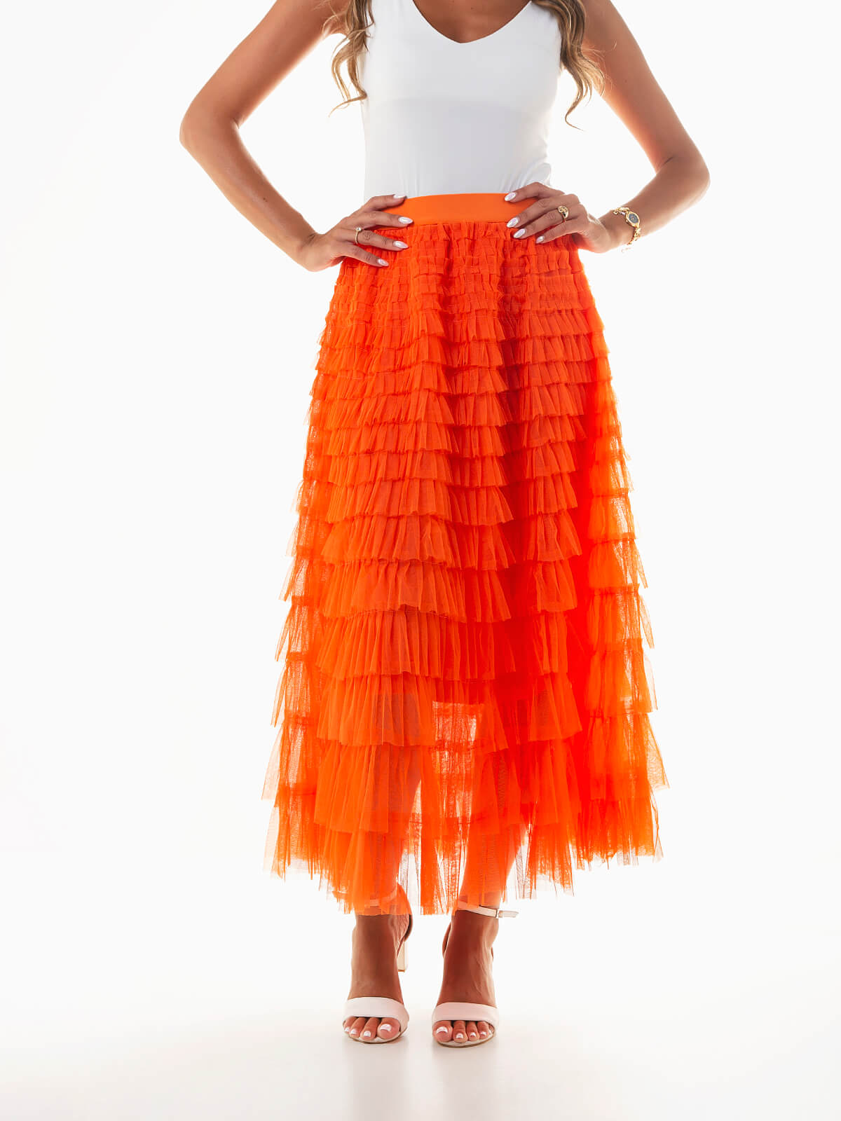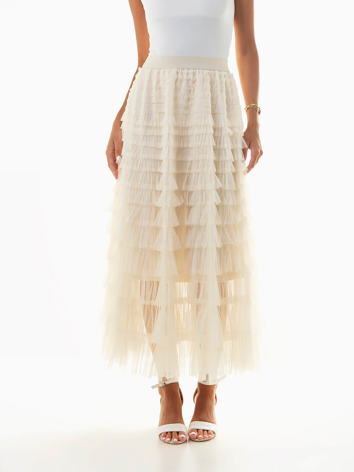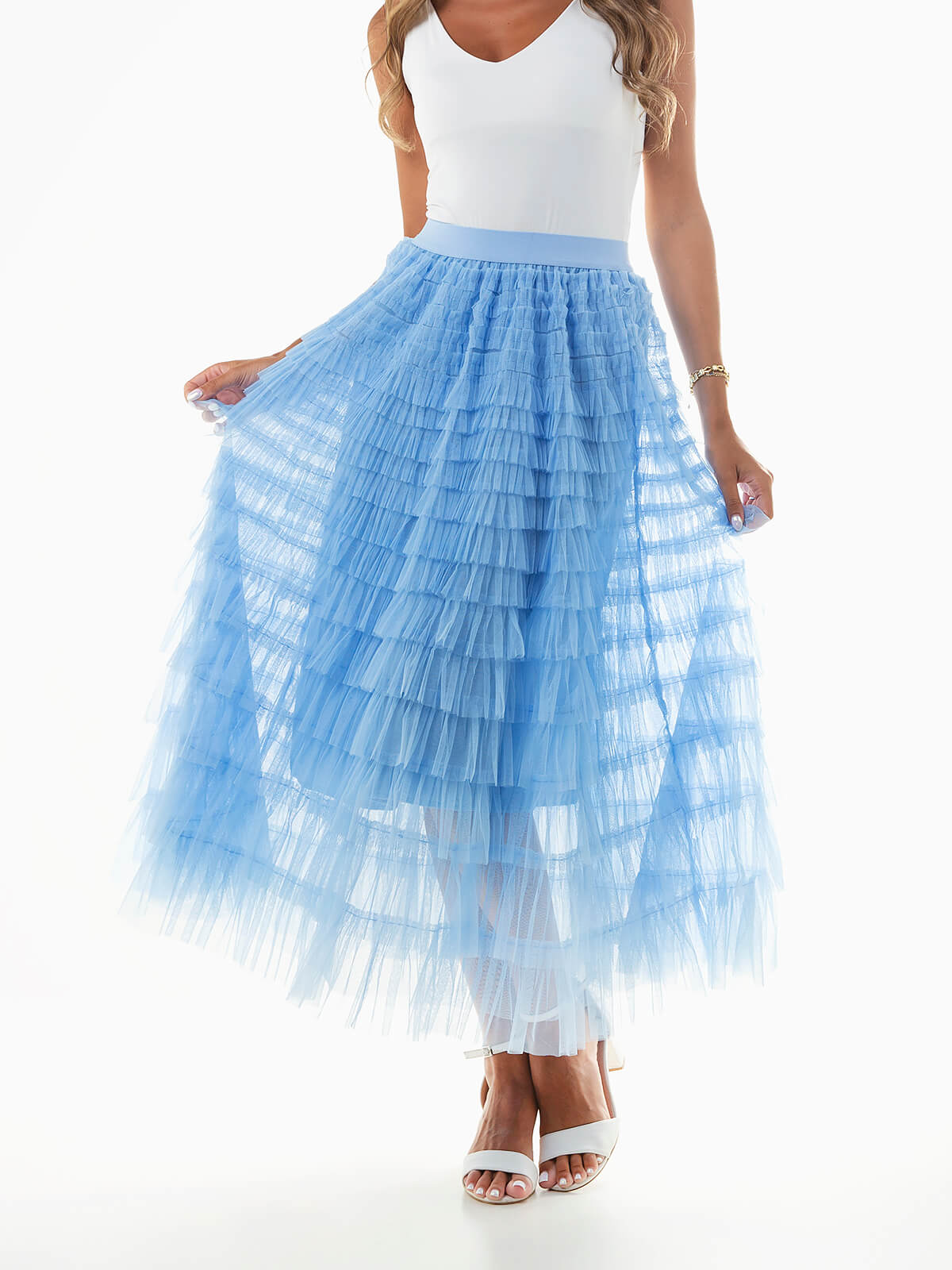 Saia comprida em tule com folhos sobrepostos, perfeita para criar looks femininos e cheios de movimento. Modelo de cintura alta elástica, com interior forrado para maior conforto. Aposta numa t-shirt básica e sandálias rasas para um look casual-chic, ou conjuga com um top rendado para um estilo mais romântico.