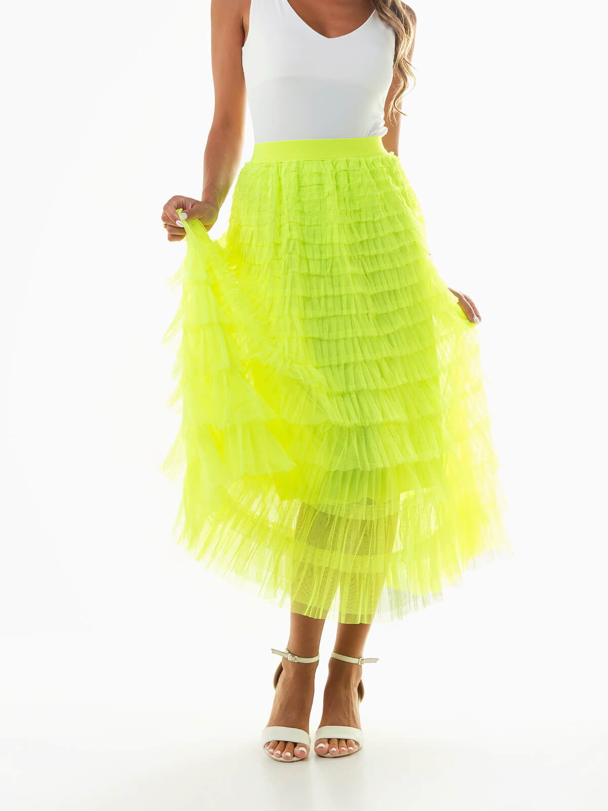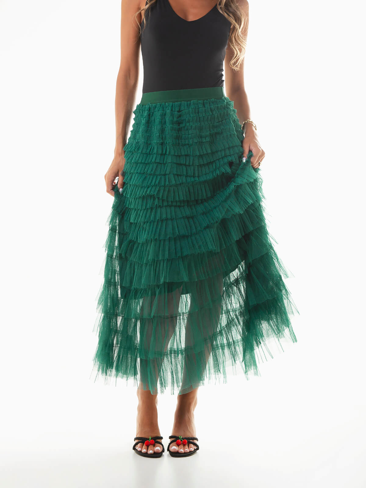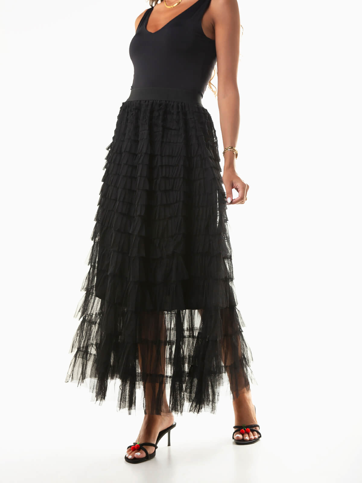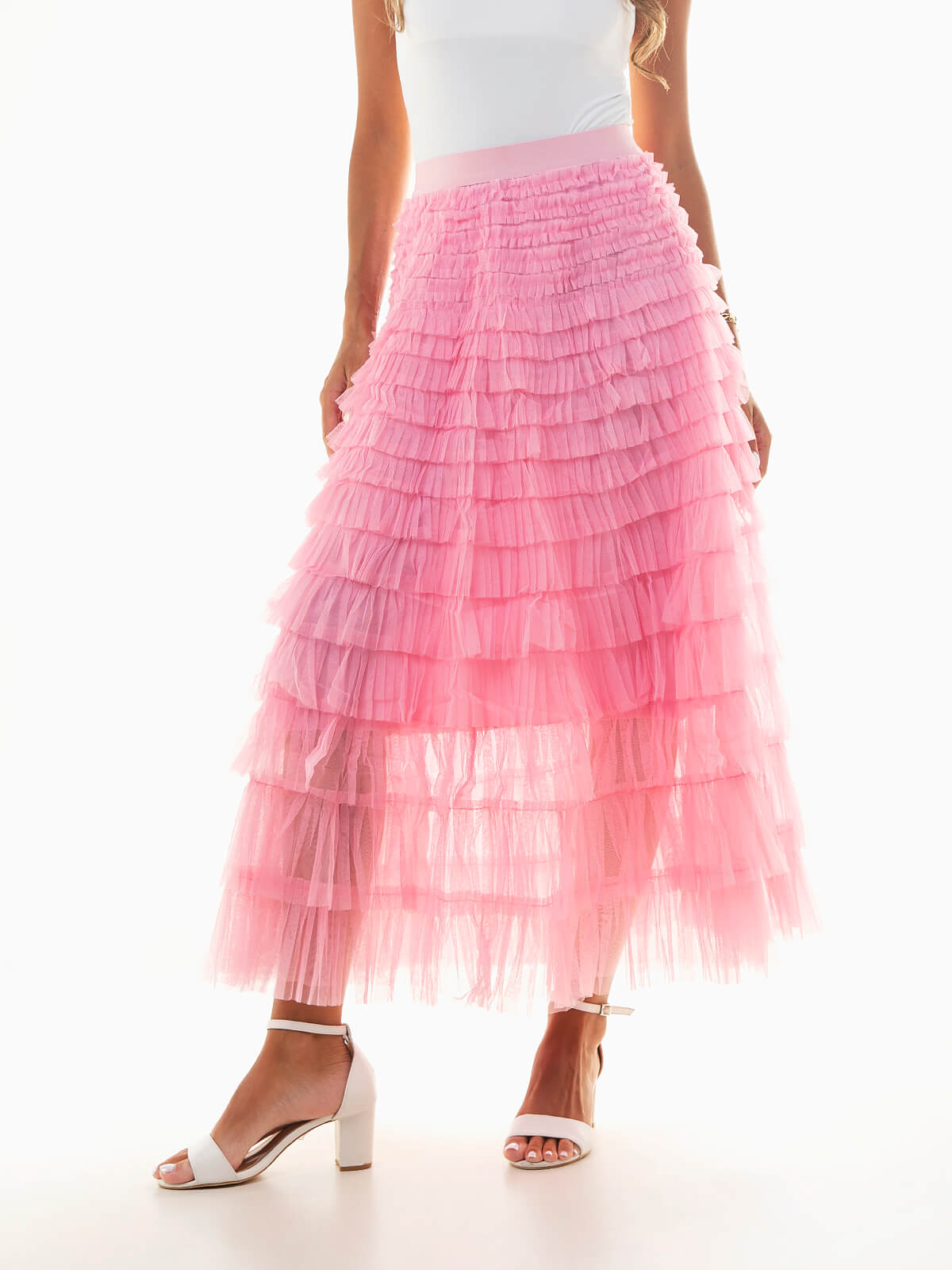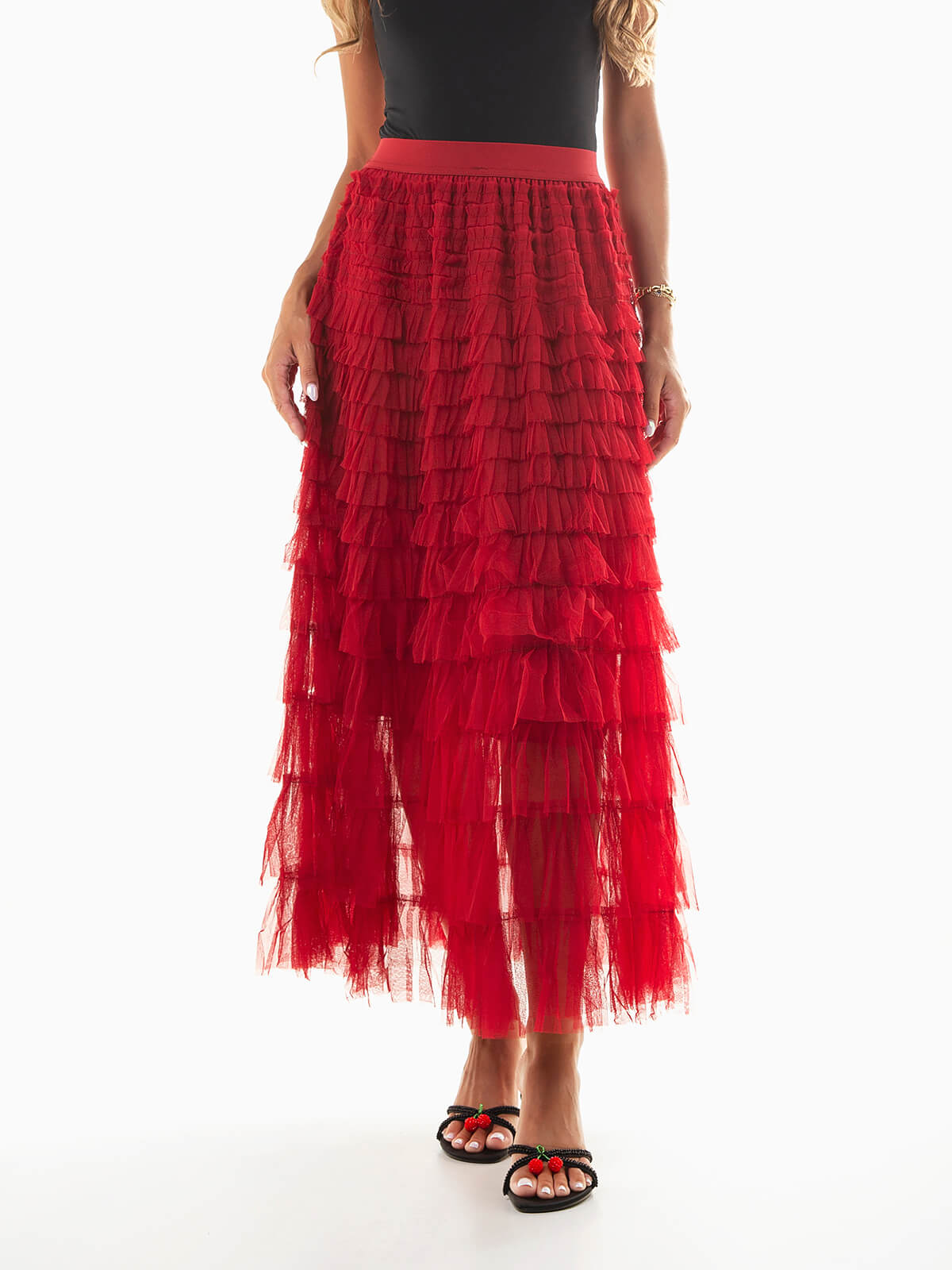 Saia comprida em tule com folhos sobrepostos, perfeita para criar looks femininos e cheios de movimento. Modelo de cintura alta elástica, com interior forrado para maior conforto. Aposta numa t-shirt básica e sandálias rasas para um look casual-chic, ou conjuga com um top rendado para um estilo mais romântico.