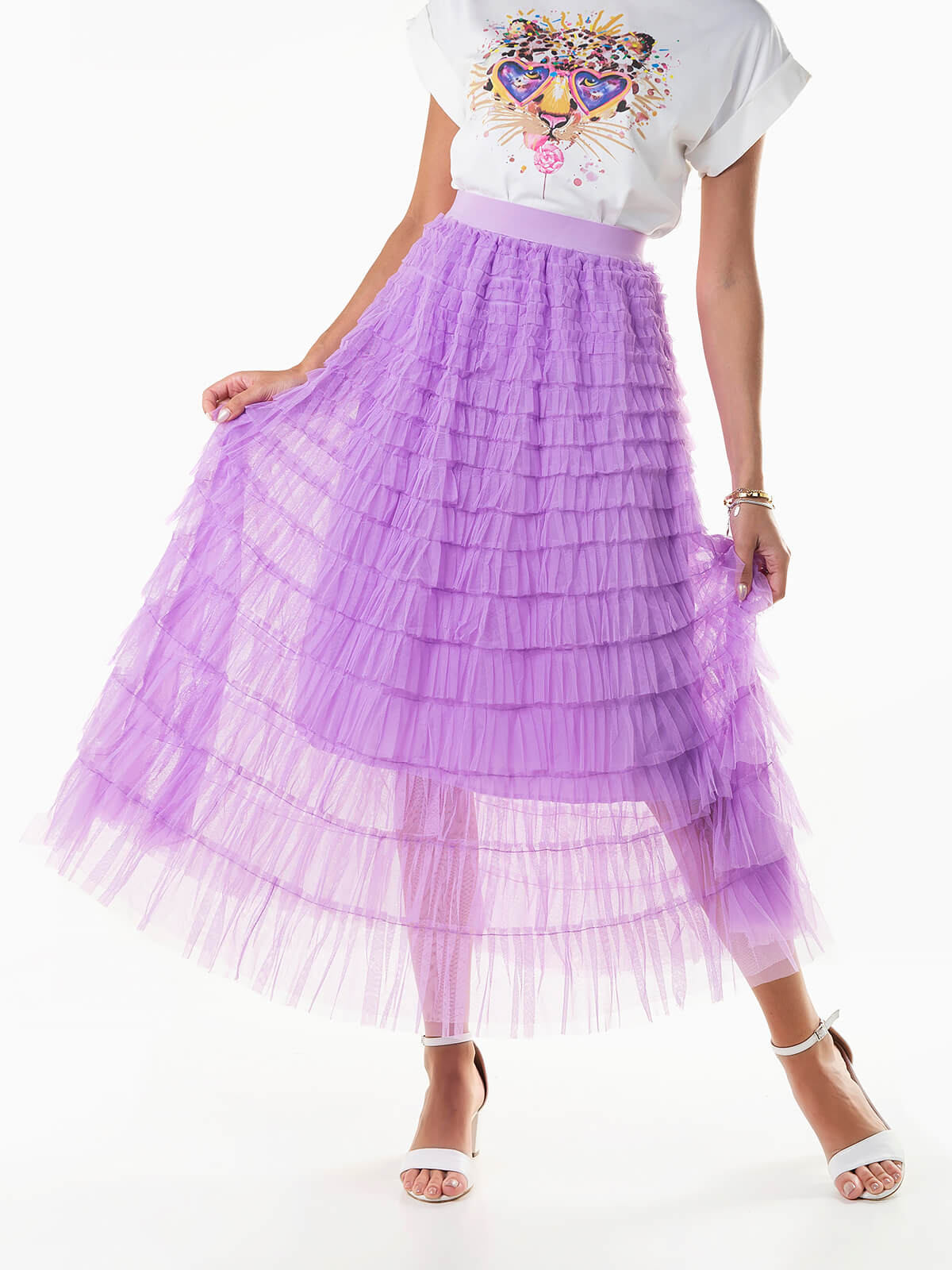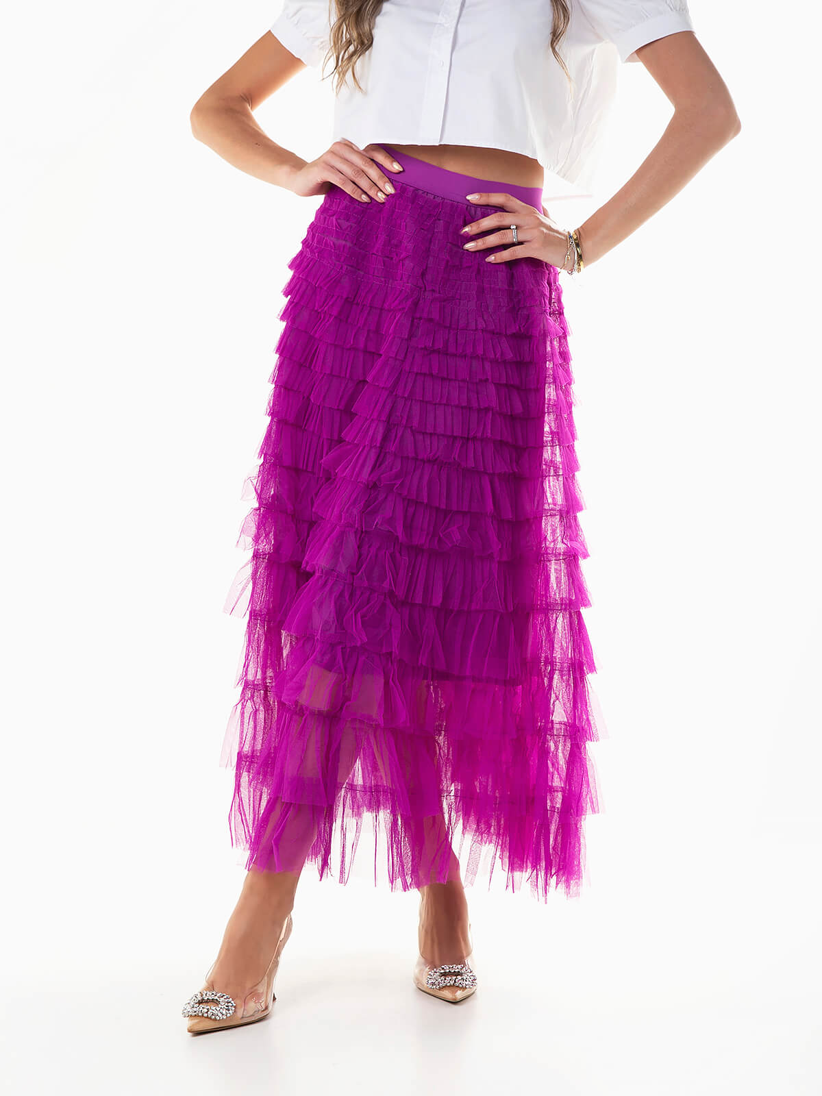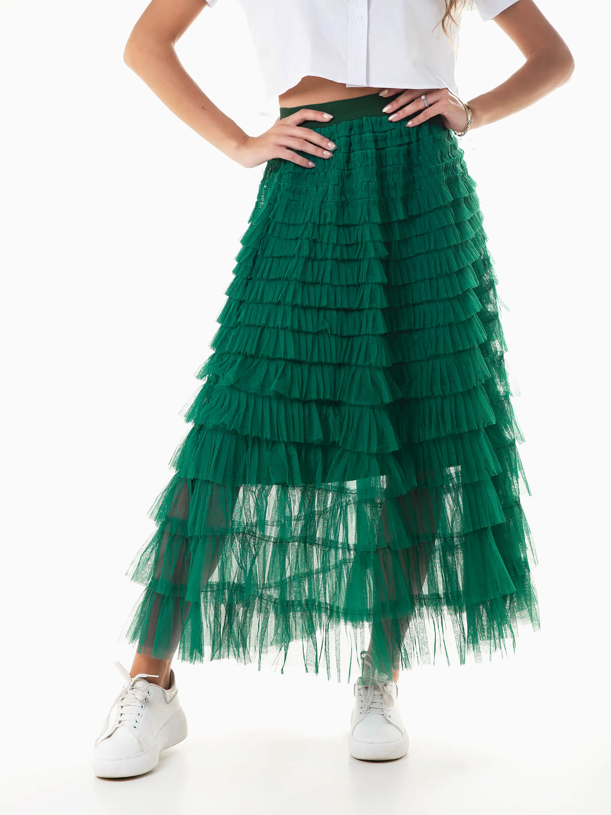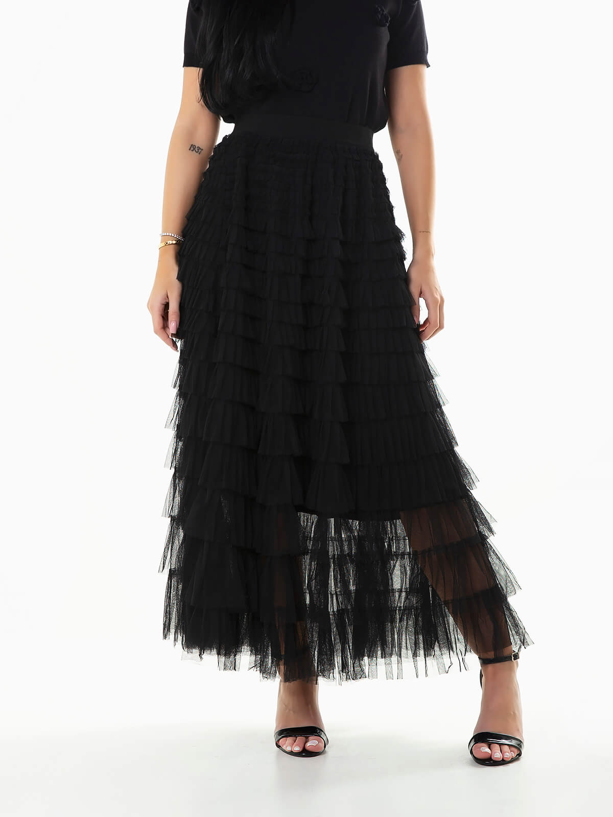 Saia de tule comprida com folhos sobrepostos. Saia para senhora com cintura alta elástica. Interior forrado.