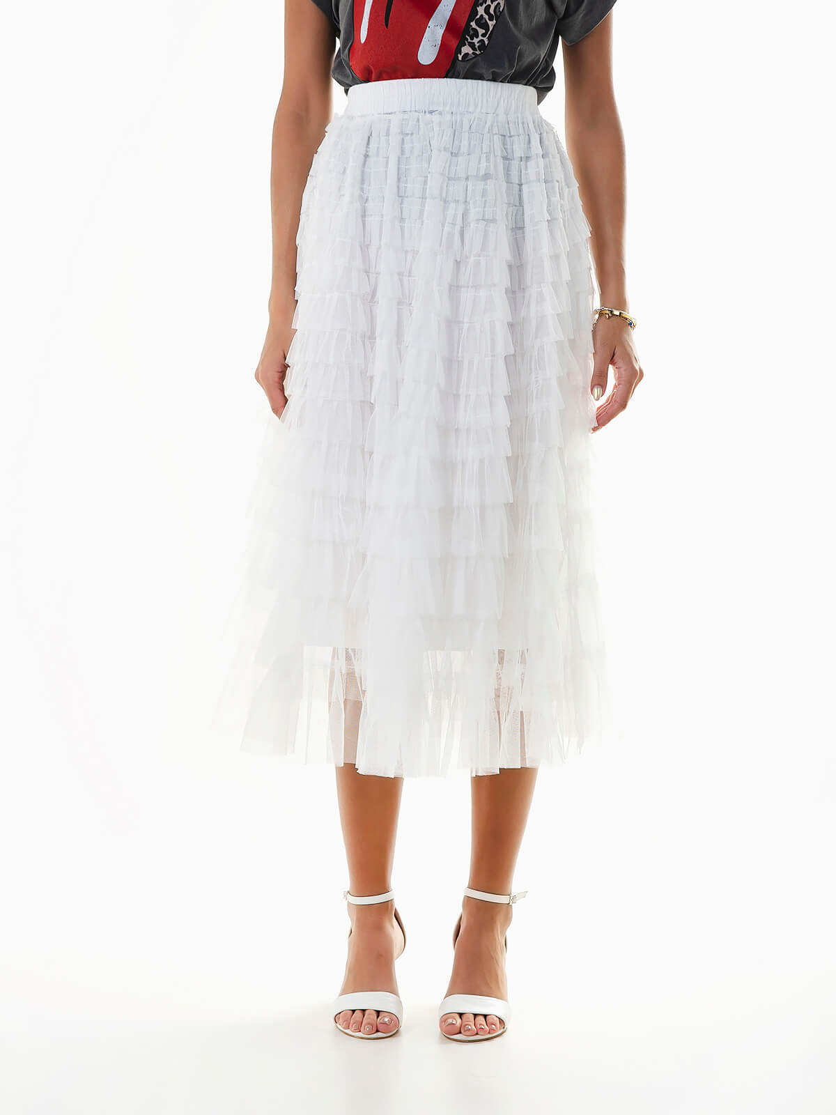 Saia midi branca de tule com folhos sobrepostos. Saia para senhora com cintura alta elástica. Interior forrado.