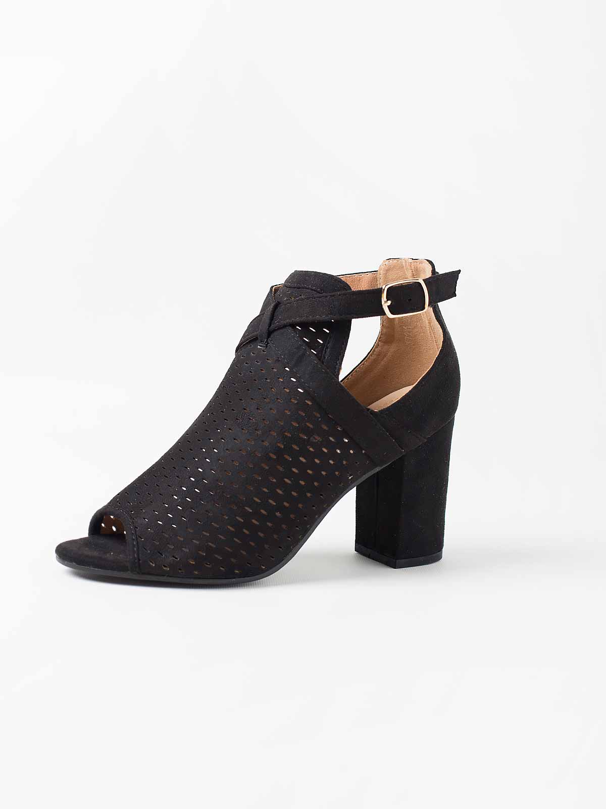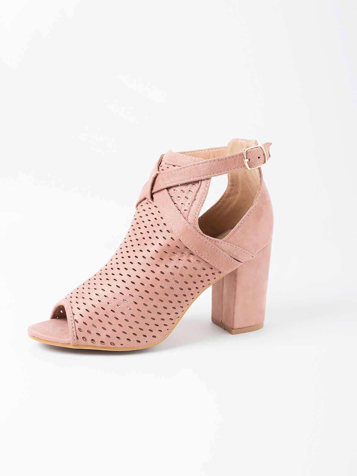 Sandálias camurça com pormenores abertos. Sandálias de salto alto abertas. Aperto de fivela. Altura 9 cm.