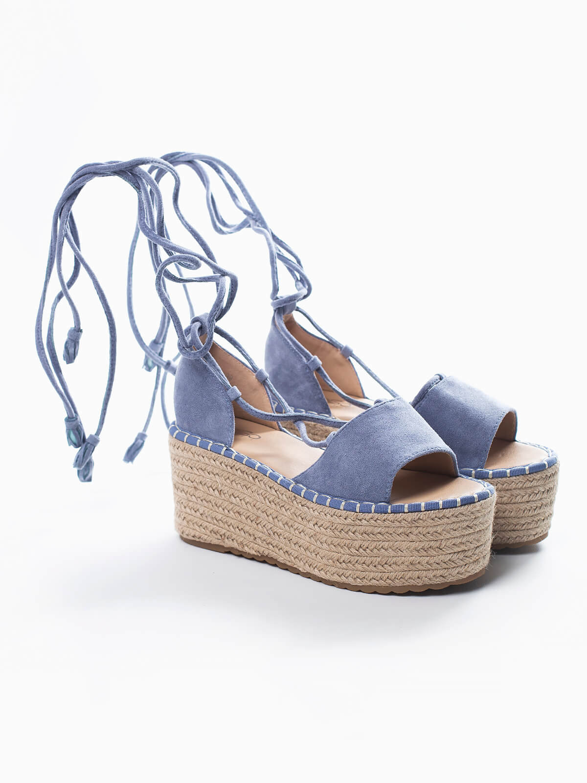 Sandálias plataforma azuis com cordões para aperto. Sandálias altas em veludo com sola em rafia. Fechadas atrás. Altura 8 cm.
