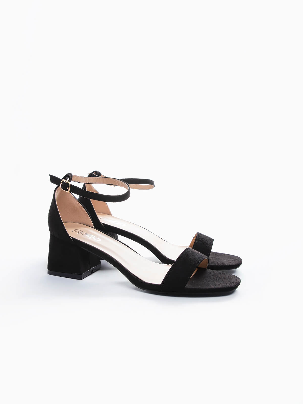 Sandálias de tacão pretas em veludo para senhora. Sandálias com biqueira redonda. Fecho com fivela no tornozelo.