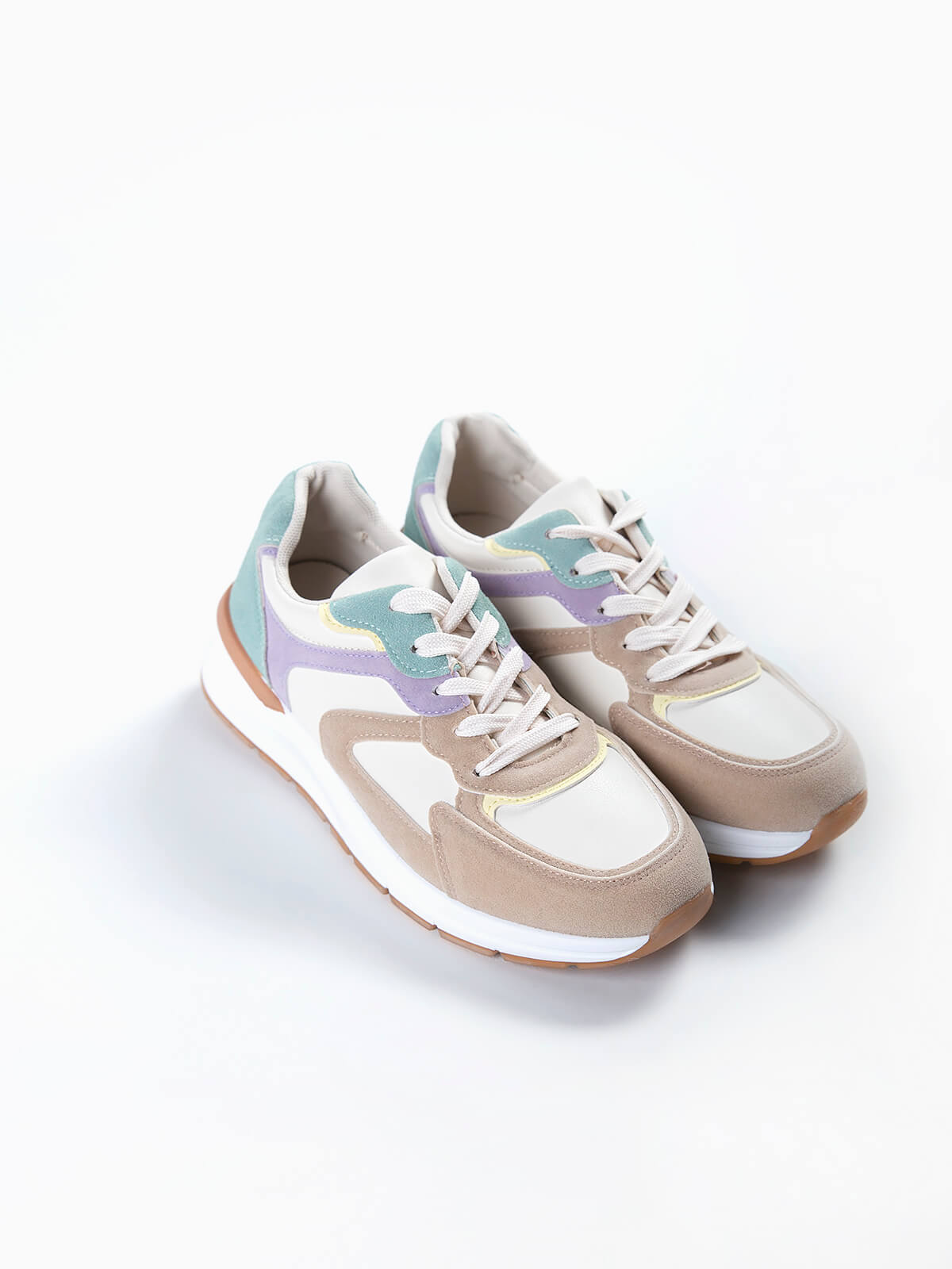 Sapatilhas bege combinadas em vários materiais e cores. Ténis com sola alta. Aperto de cordões.