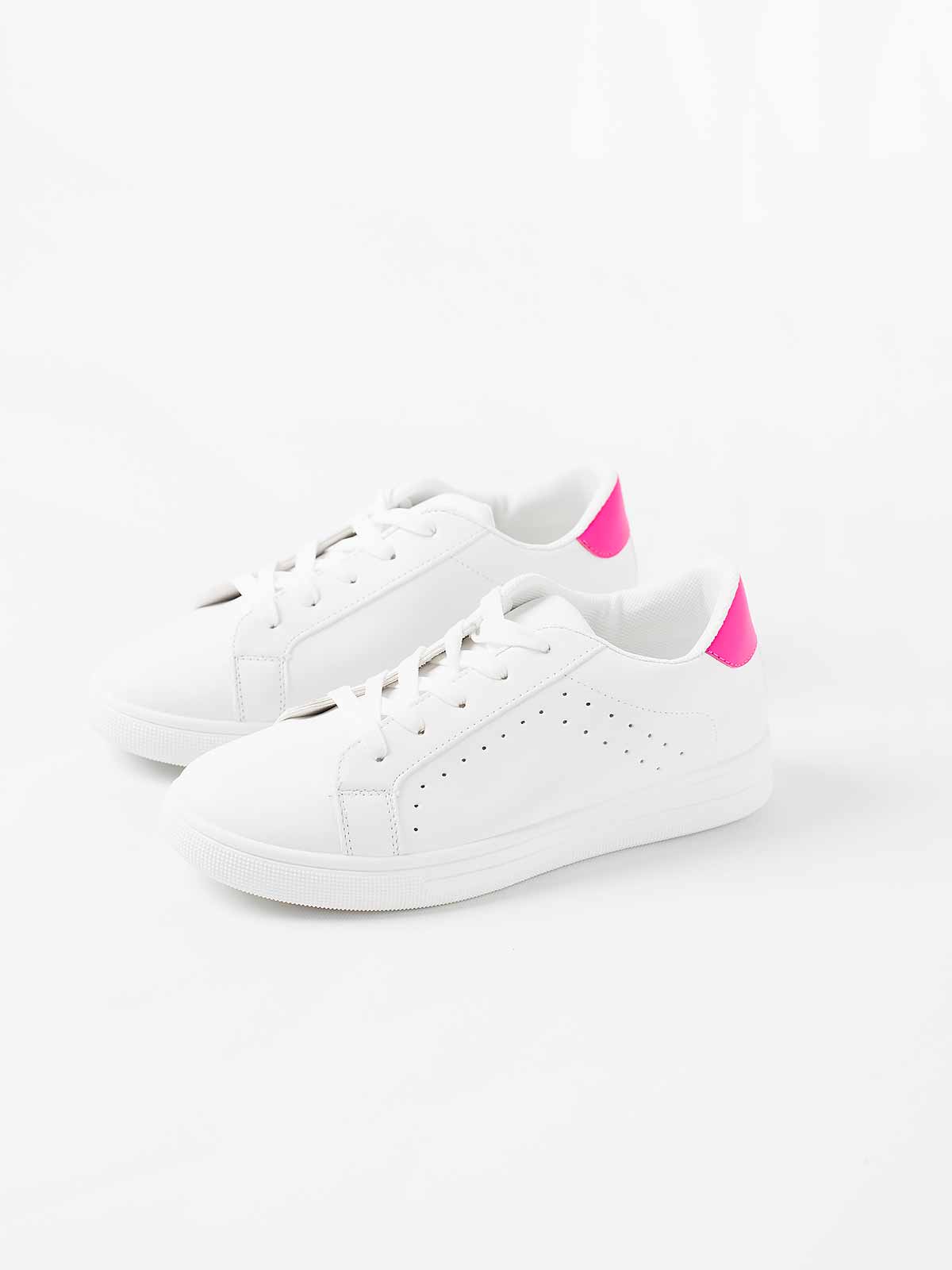 Sapatilhas brancas com encaixe rosa atrás. Sapatilhas brancas com atacadores.