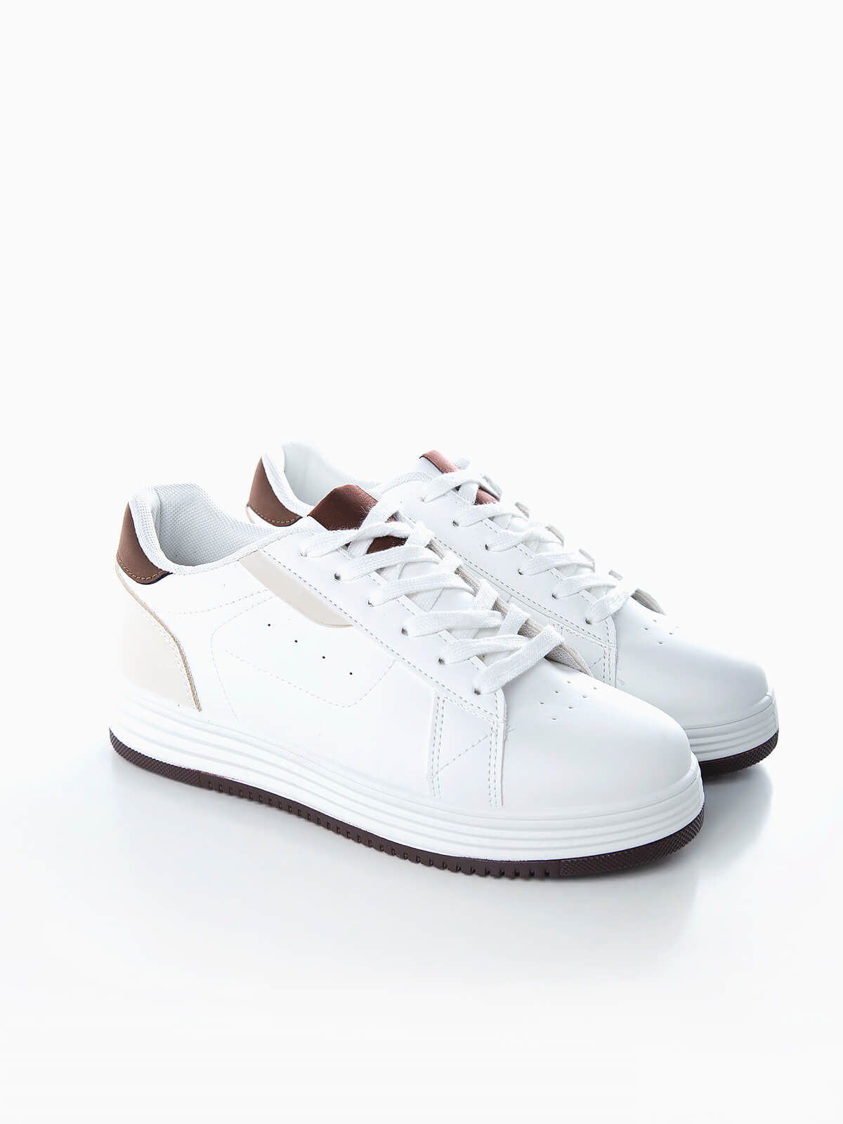 Sapatilhas brancas combinadas com vários materias e pormenores de cor. Ténis de sola alta. Aperto de botões.