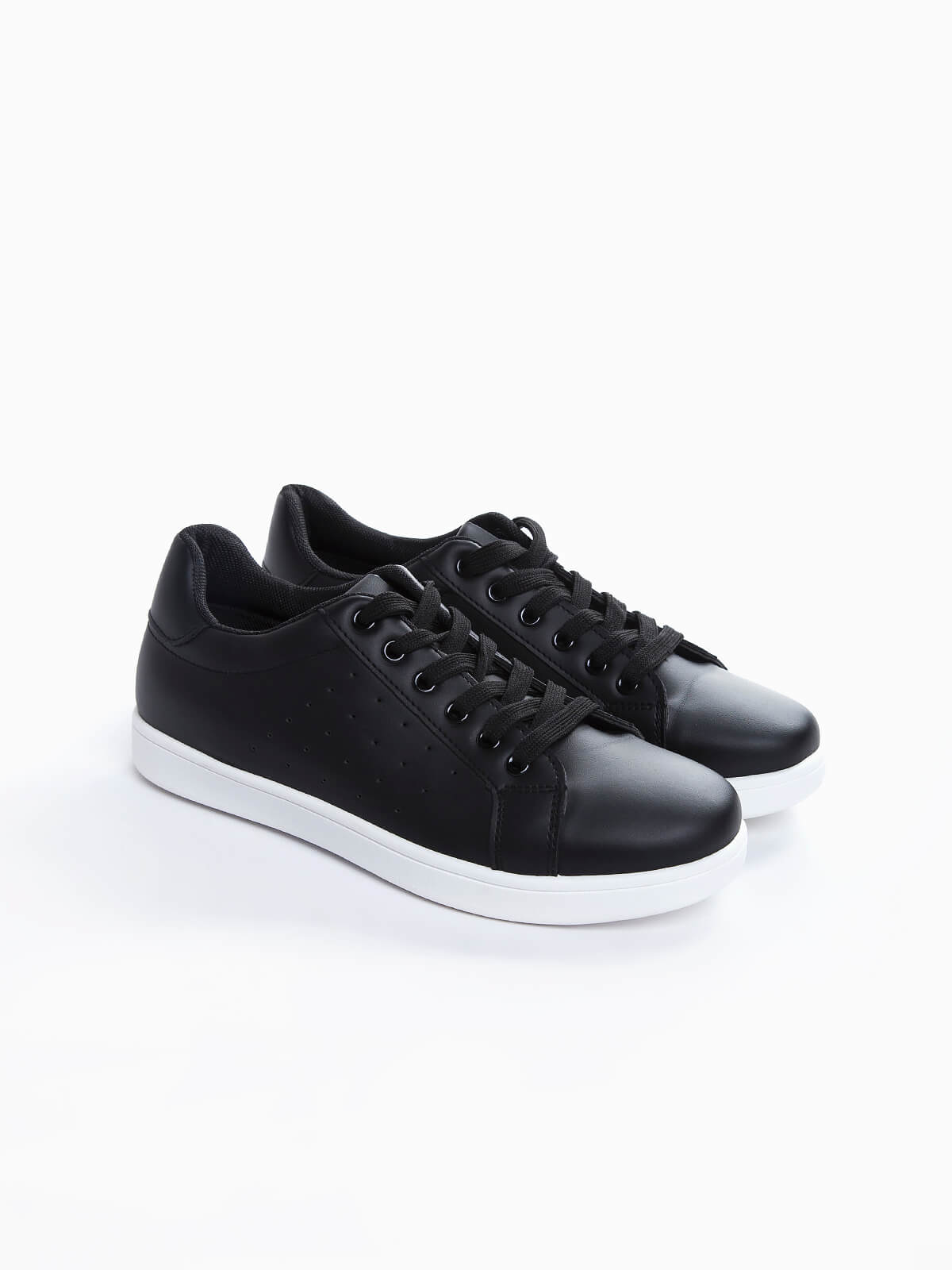 Sapatilhas desportivas pretas para senhora. Ténis efeito pele com biqueira redonda. Aperto de cordões.