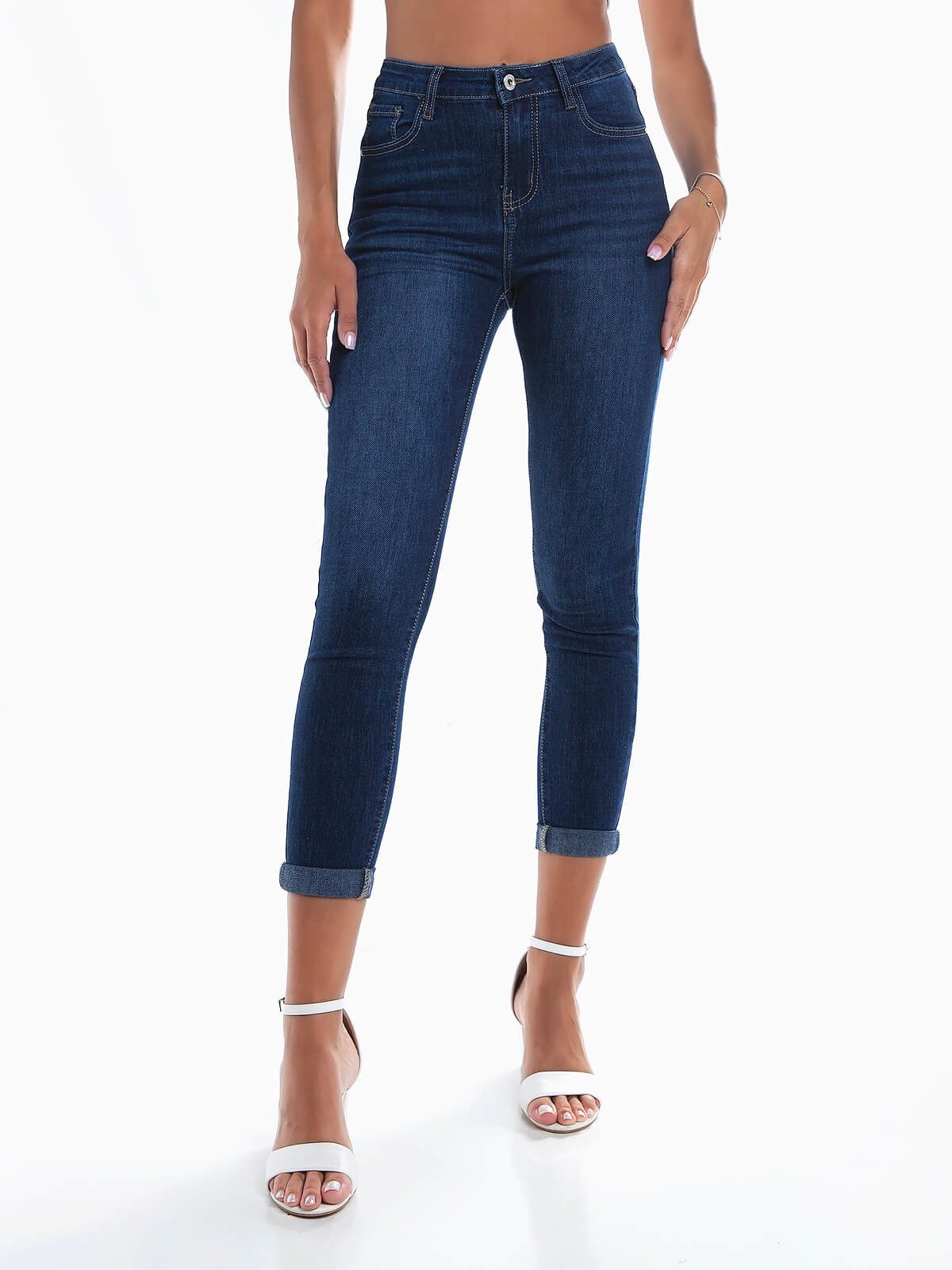 Skinny jeans de cintura alta para senhora. Calças ganga elásticas com lavagem azul escuro. 5 bolsos. Aperto de fecho éclair e botão.