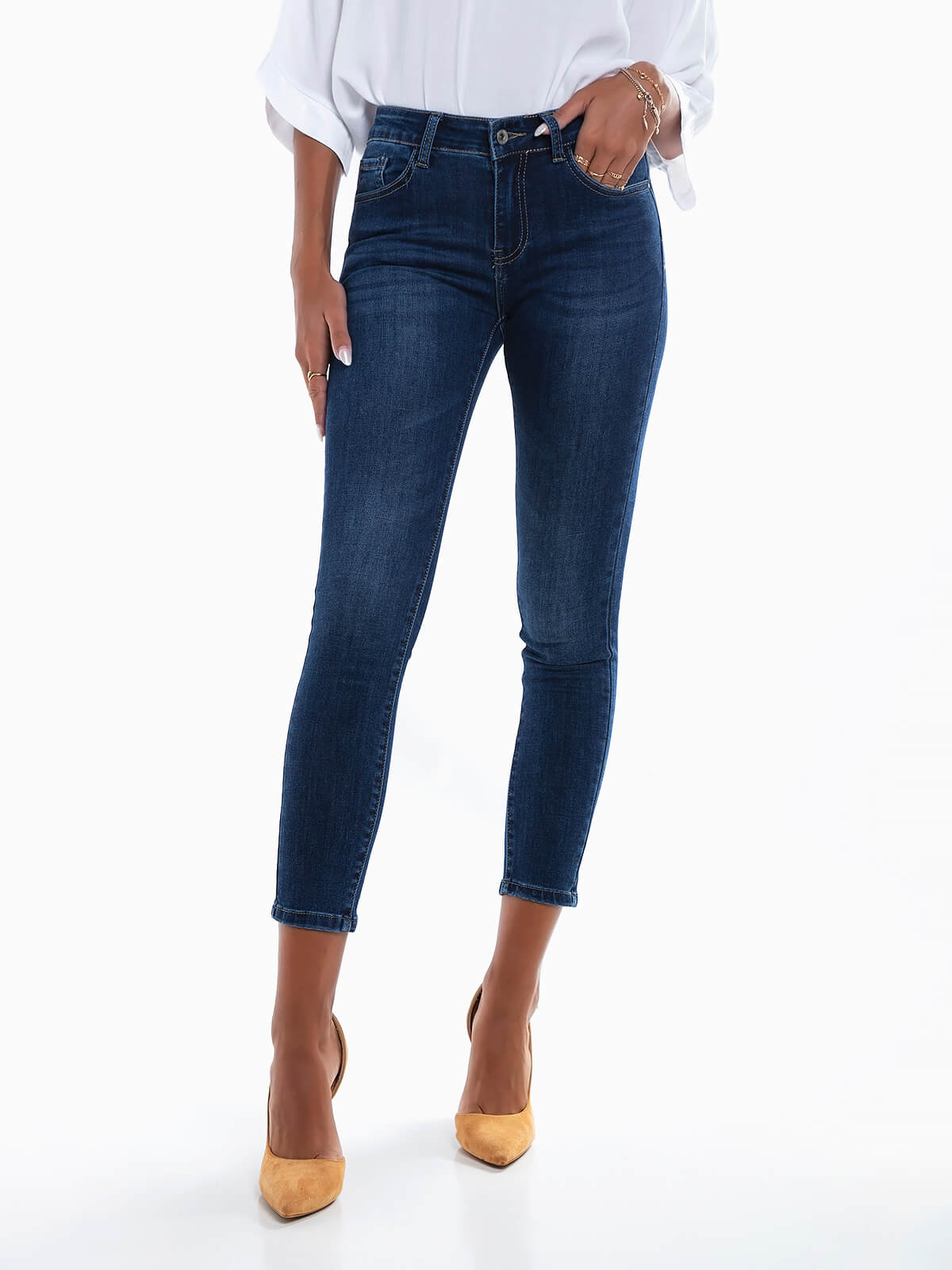 Skinny jeans com aplicações de missangas e lantejoulas nos punhos. Calças ganga lavagem azul escuro com cintura alta elástico. 5 bolsos. Aperto fecho éclair e botão.