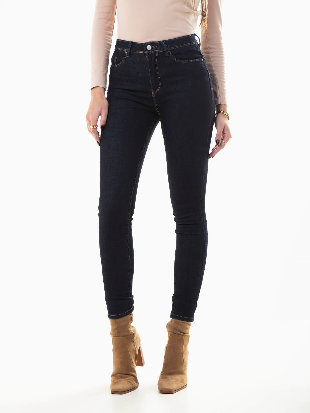 Skinny jeans com efeito ultra push-up para mulher. Calças de ganga cintura alta com lavagem azul escuro. 5 bolsos. Aperto de fecho éclair e botão.
