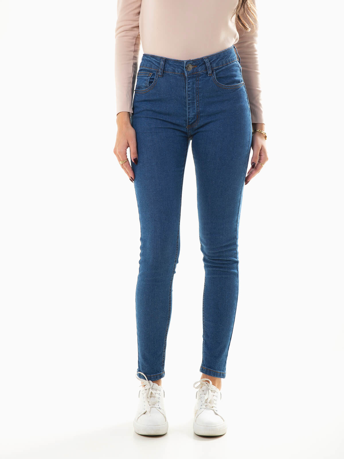 Skinny jeans de cintura média para senhora. Calças de ganga com lavagem azul escuro e 5 bolsos. Aperto fecho éclair e botão.
