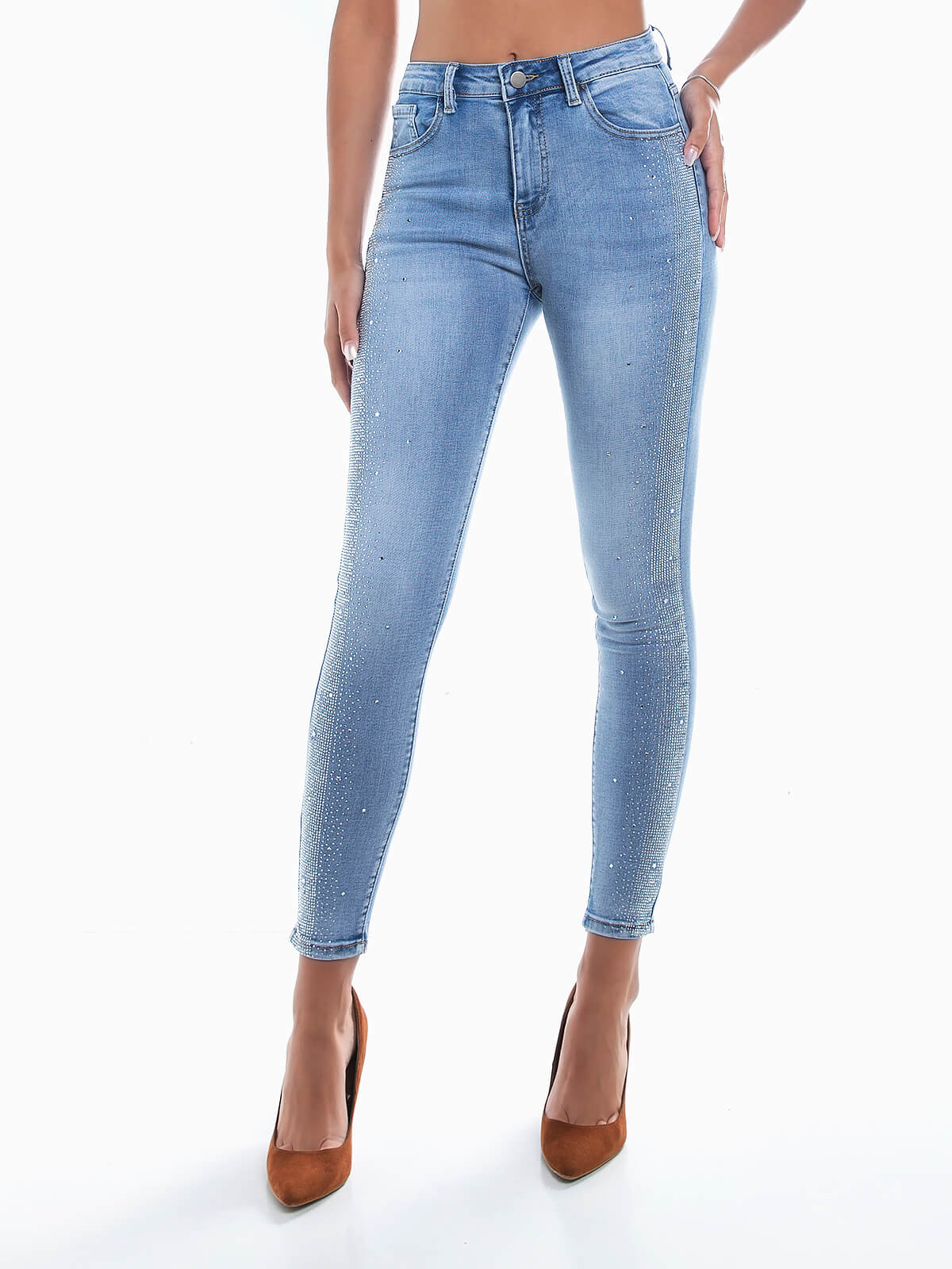 Skinny jeans embelezadas com pedras brilhantes. Jeans de lavagem azul claro e cintura alta. 5 bolsos. Aperto de fecho éclair e botão.