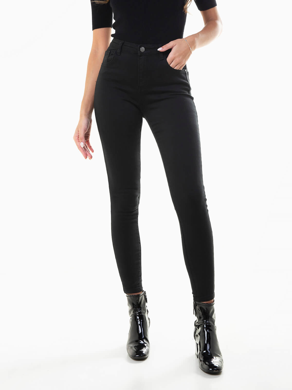 Calças ganga pretas com cintura alta, 5 bolsos e aperto fecho éclair e botão. Confortáveis e versáteis, perfeitas para criar tanto looks urbanos como elegantes.