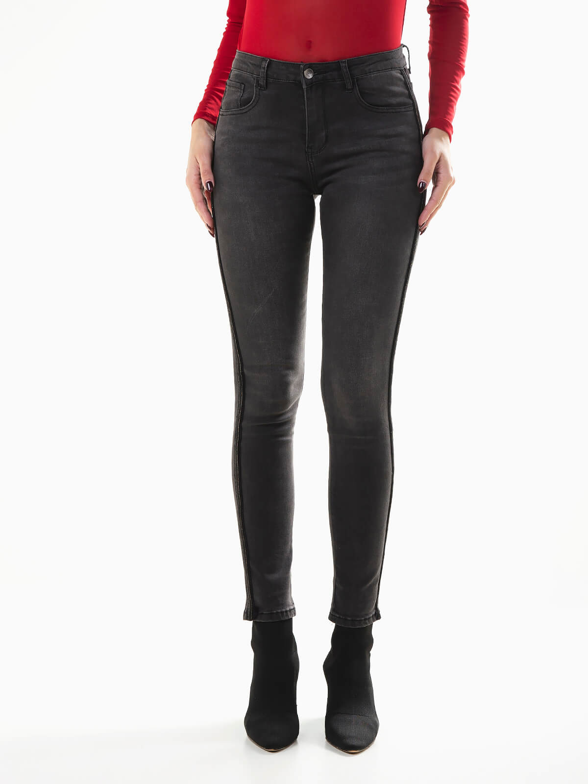 Skinny jeans pretas com cintura média para senhora. Calças ganga com pormenores em contraste nas laterais. 5 bolsos. Aperto de fecho éclair e botão.