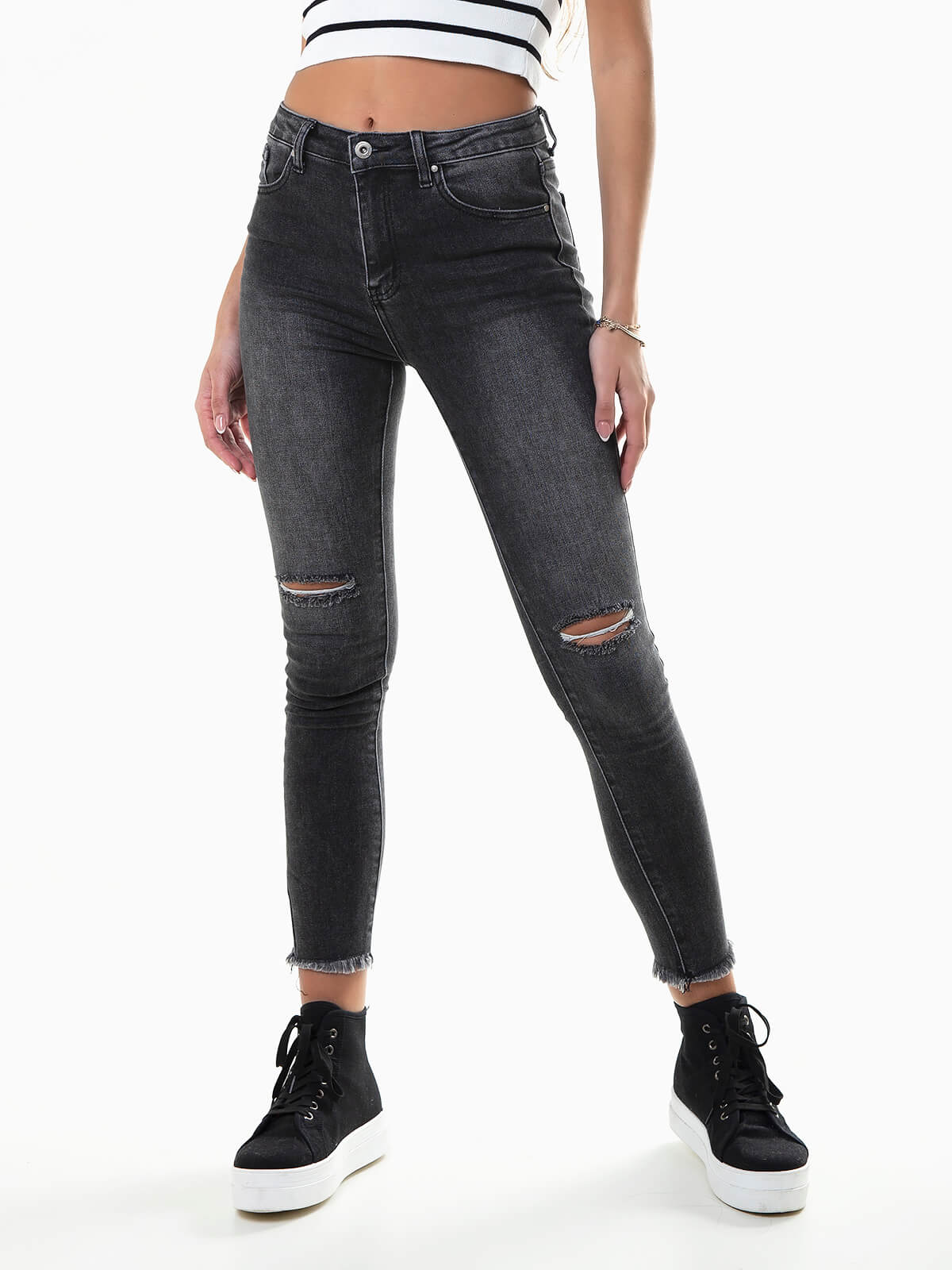 Skinny jeans pretas com leves rasgos nos joelhos. Calças ganga de cintura média com 5 bolsos. Base desfiada. Aperto de fecho éclair e botão.