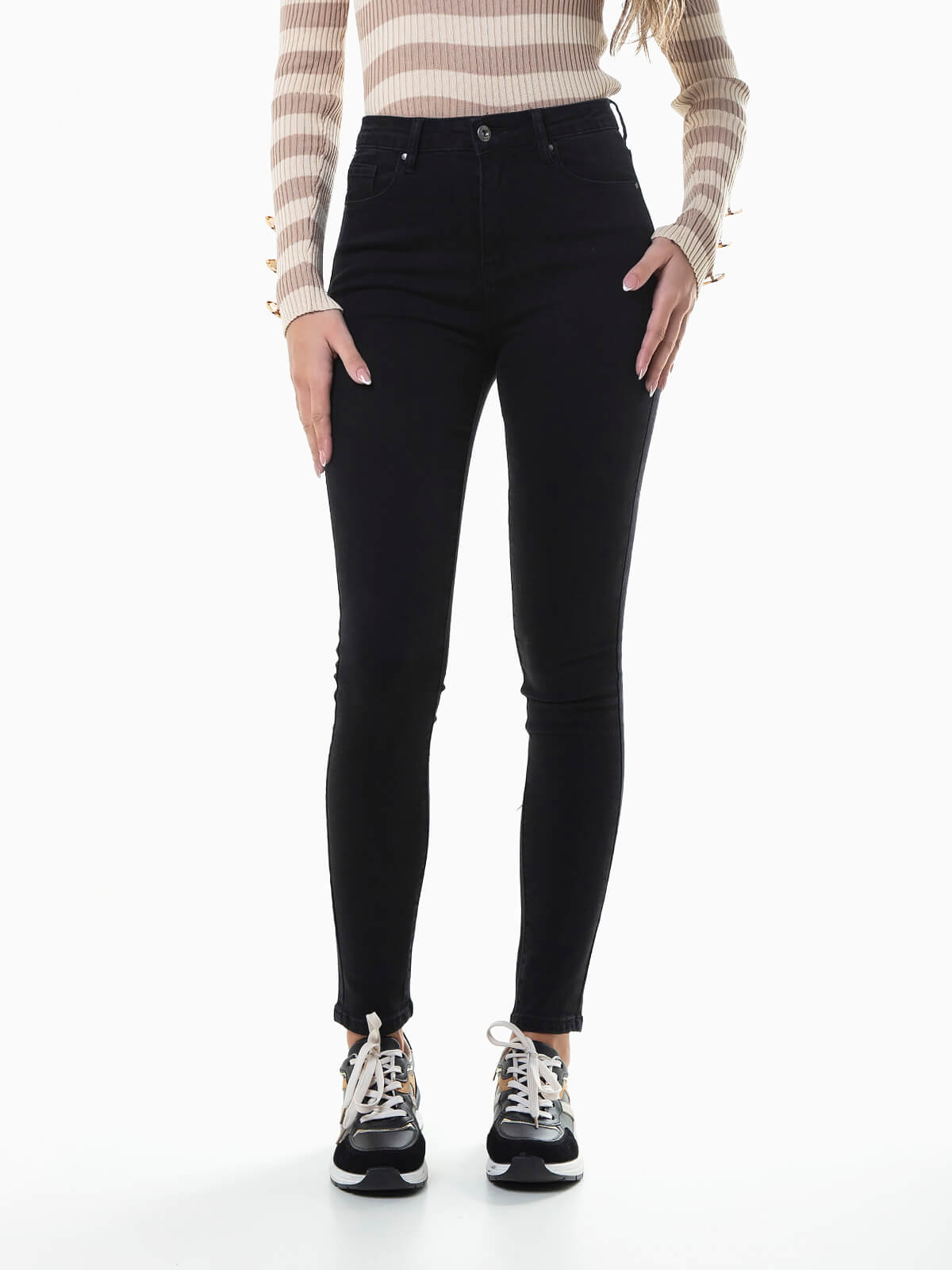 Skinny jeans pretas de cintura alta para senhora. Calças ganga elásticas com 5 bolsos. Aperto de fecho éclair e botão.