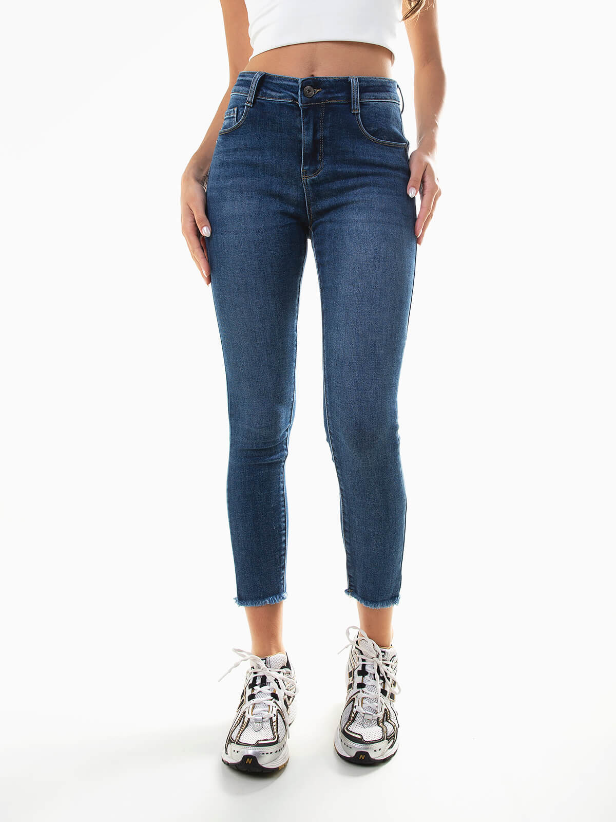 Skinny jeans efeito push-up com lavagem azul escuro para mulher. Calças ganga justas de cintura alta com 5 bolsos. Base desfiada. Aperto de fecho éclair e botão.