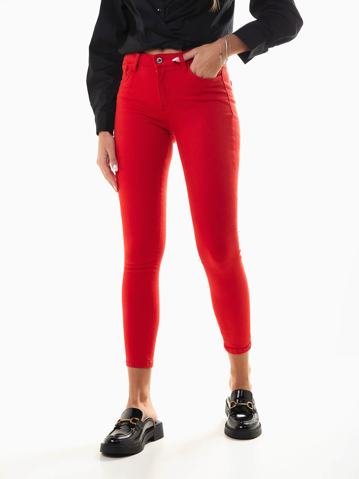 Skinny jeans vermelhas para mulher. Calças ganga elástica com cintura média e 5 bolsos. Aperto de fecho éclair e botão.