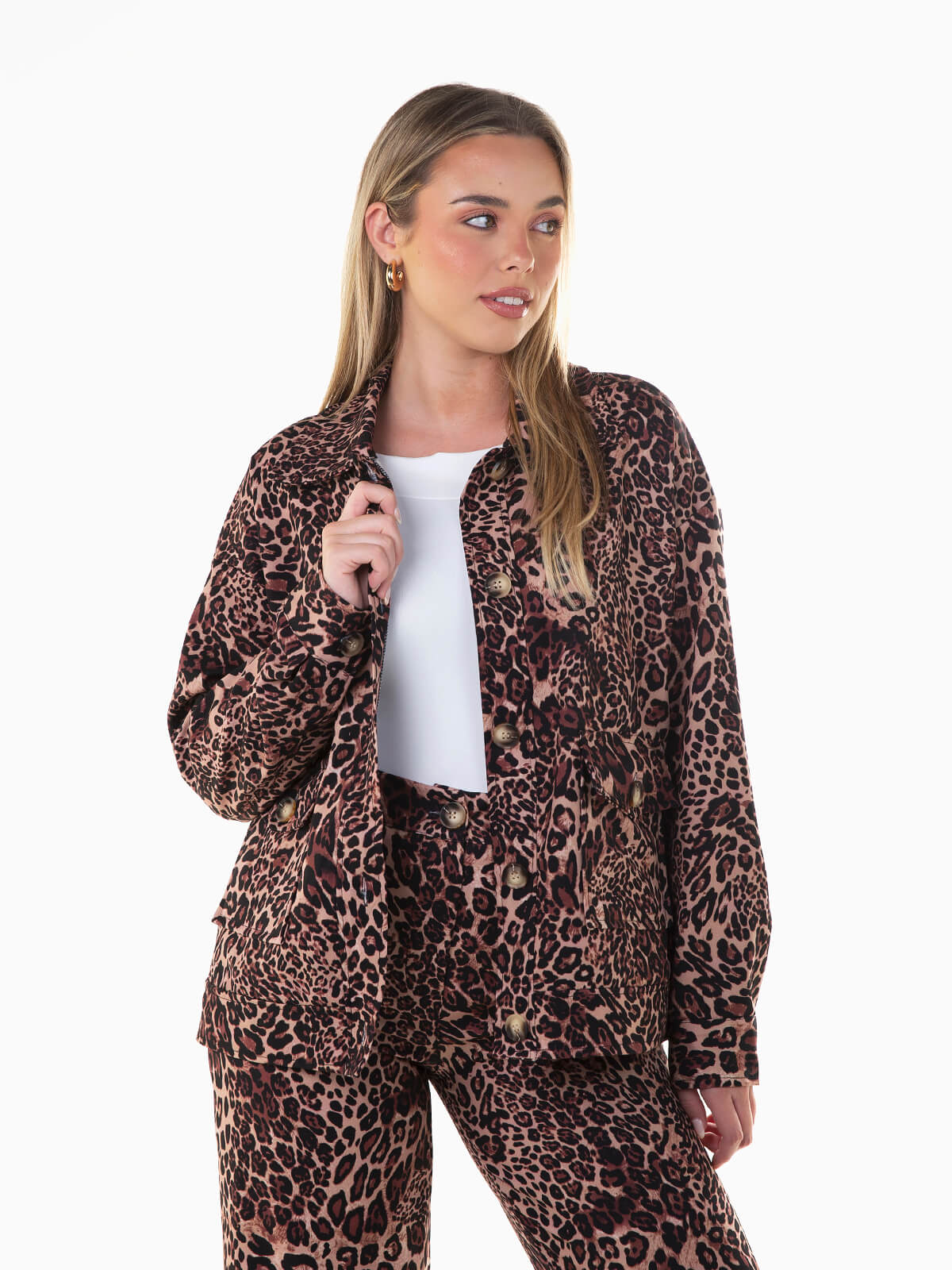 Sobrecamisa bege com estampado leopardo para mulher. Camisa em tecido fino e fluído com manga comprida e punhos abotoados. Gola abas. 2 bolsos. Aperto frontal de botões.