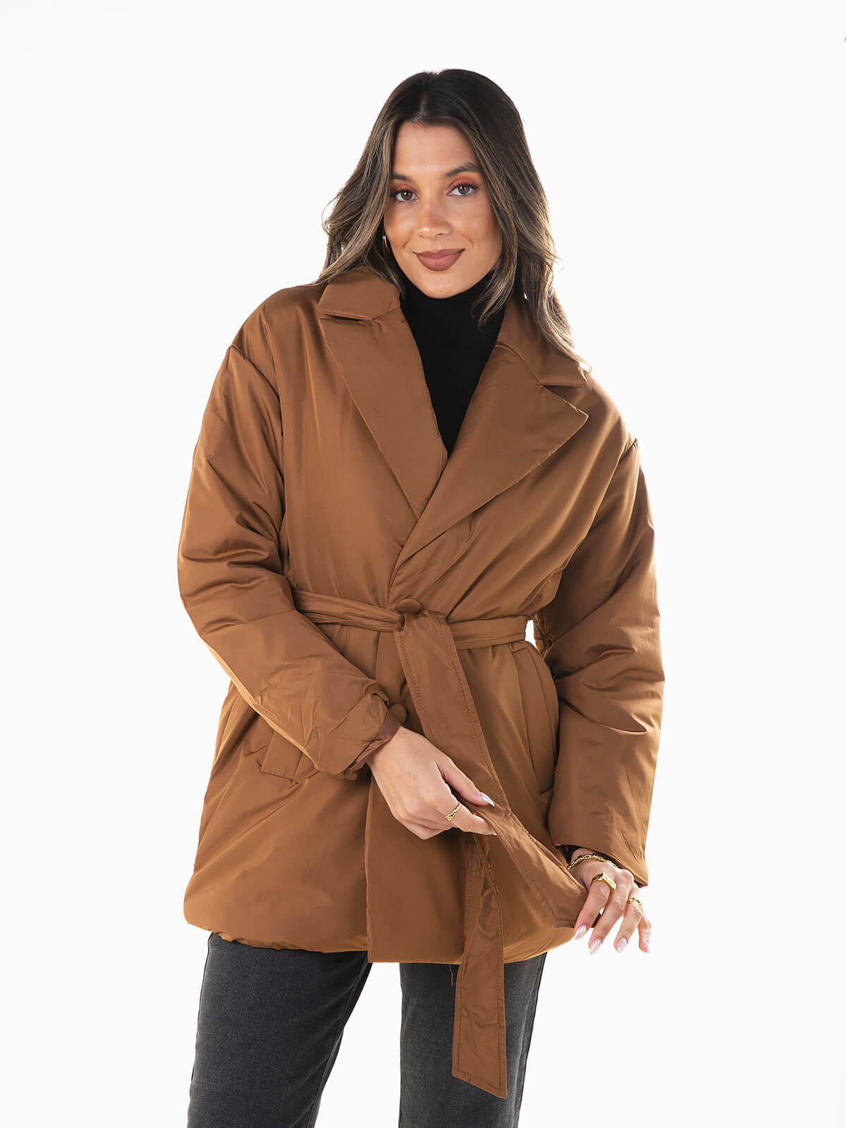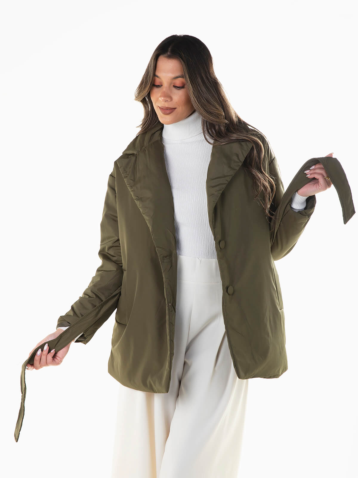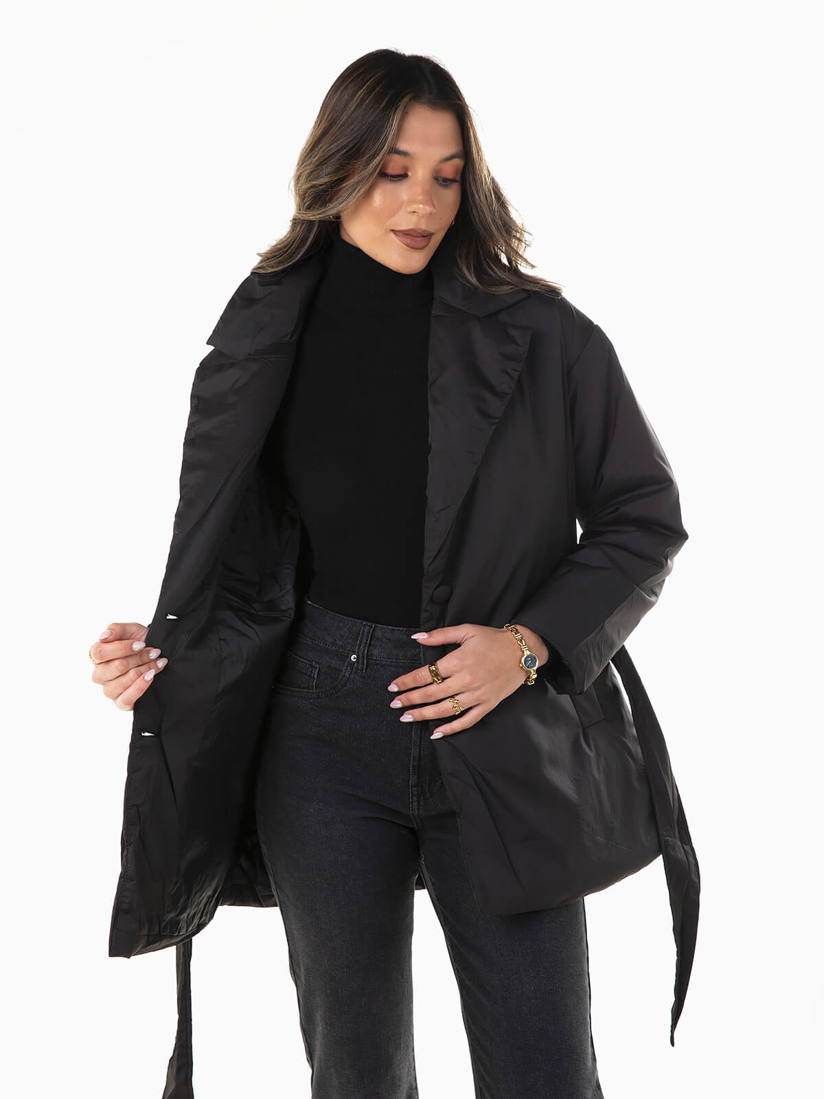 Sobretudo acolchoado com cinto removível para ajustar. Sobretudo manga comprida com interior forrado. 2 bolsos. Gola abas e lapelas. Ombros caídos. Aperto frontal de botões.