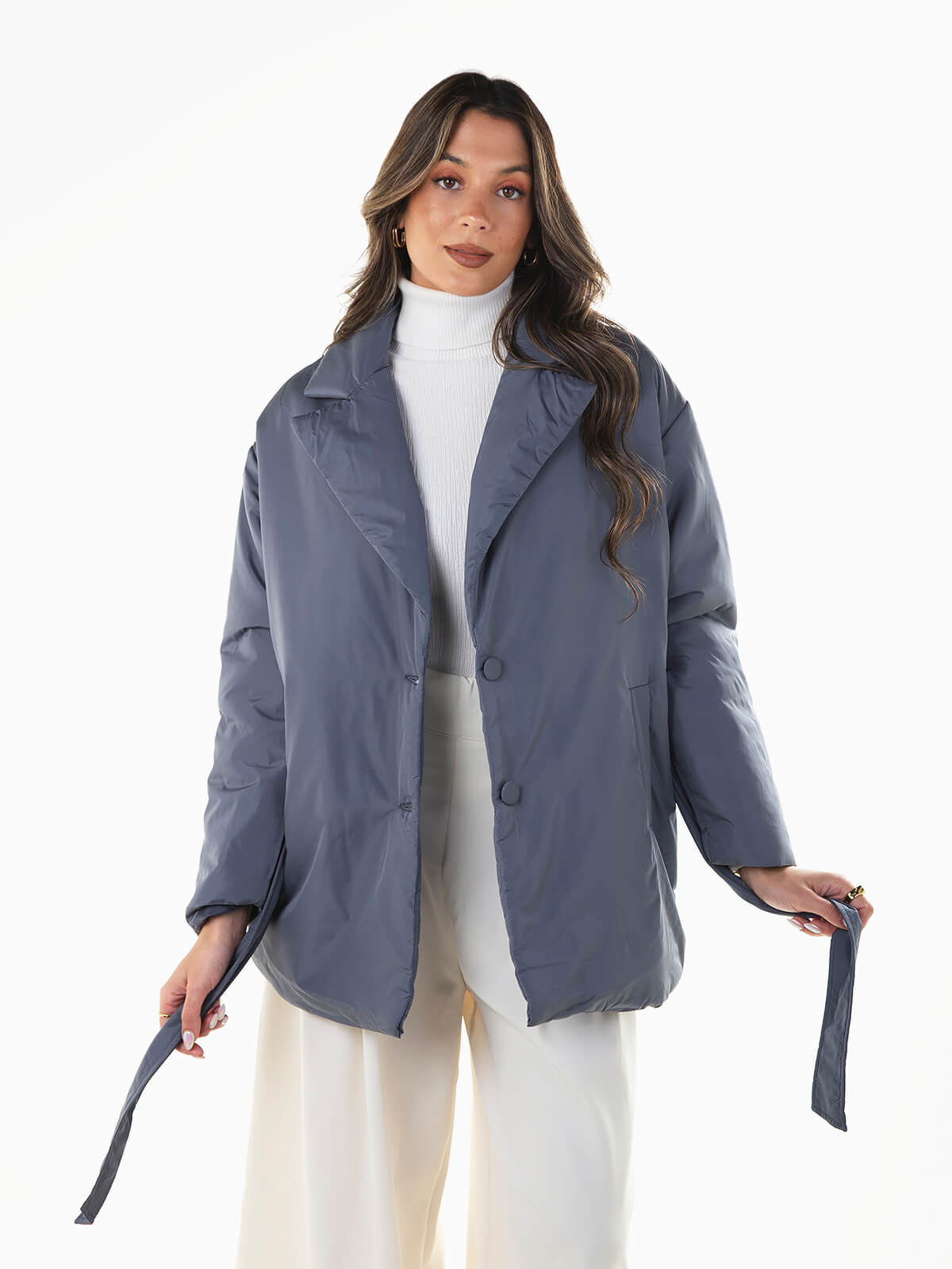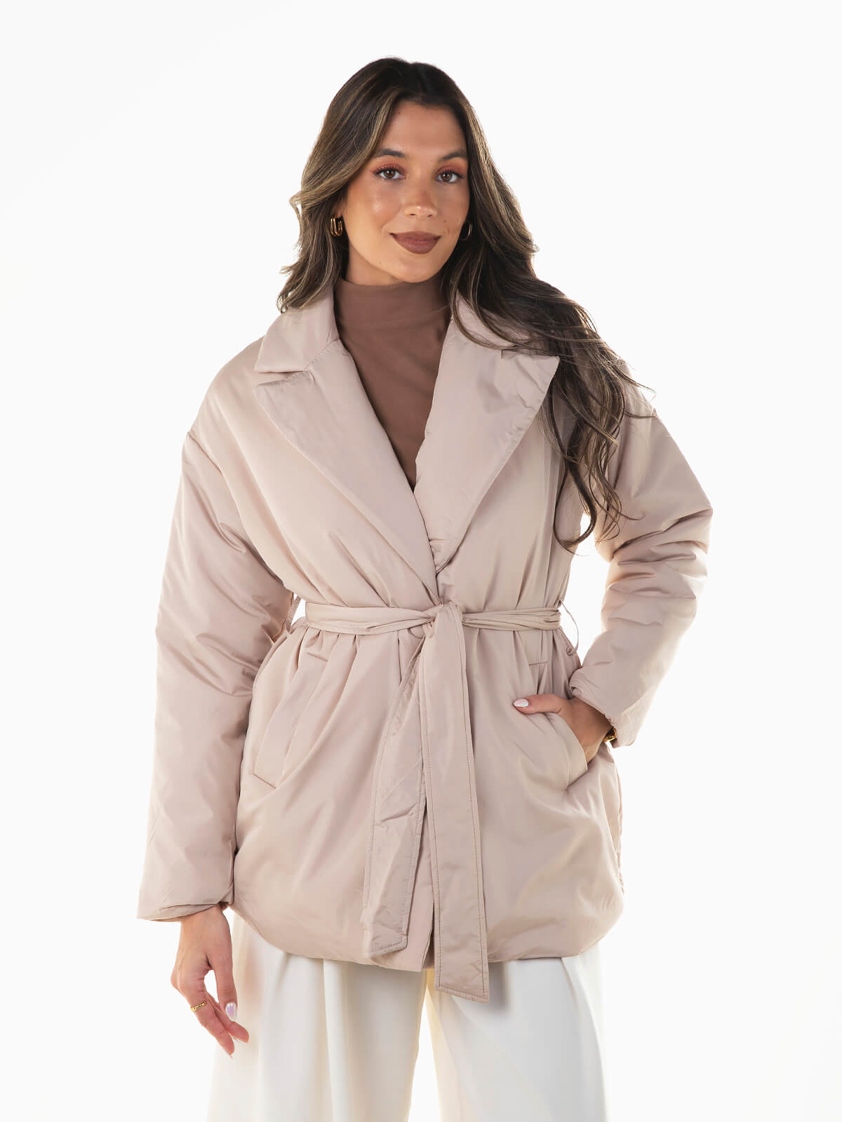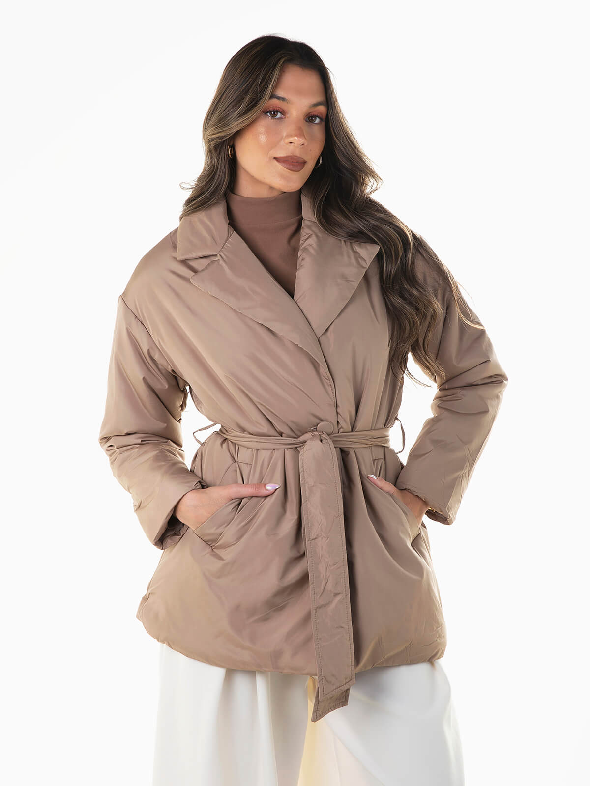 Sobretudo acolchoado com cinto removível para ajustar. Sobretudo manga comprida com interior forrado. 2 bolsos. Gola abas e lapelas. Ombros caídos. Aperto frontal de botões.