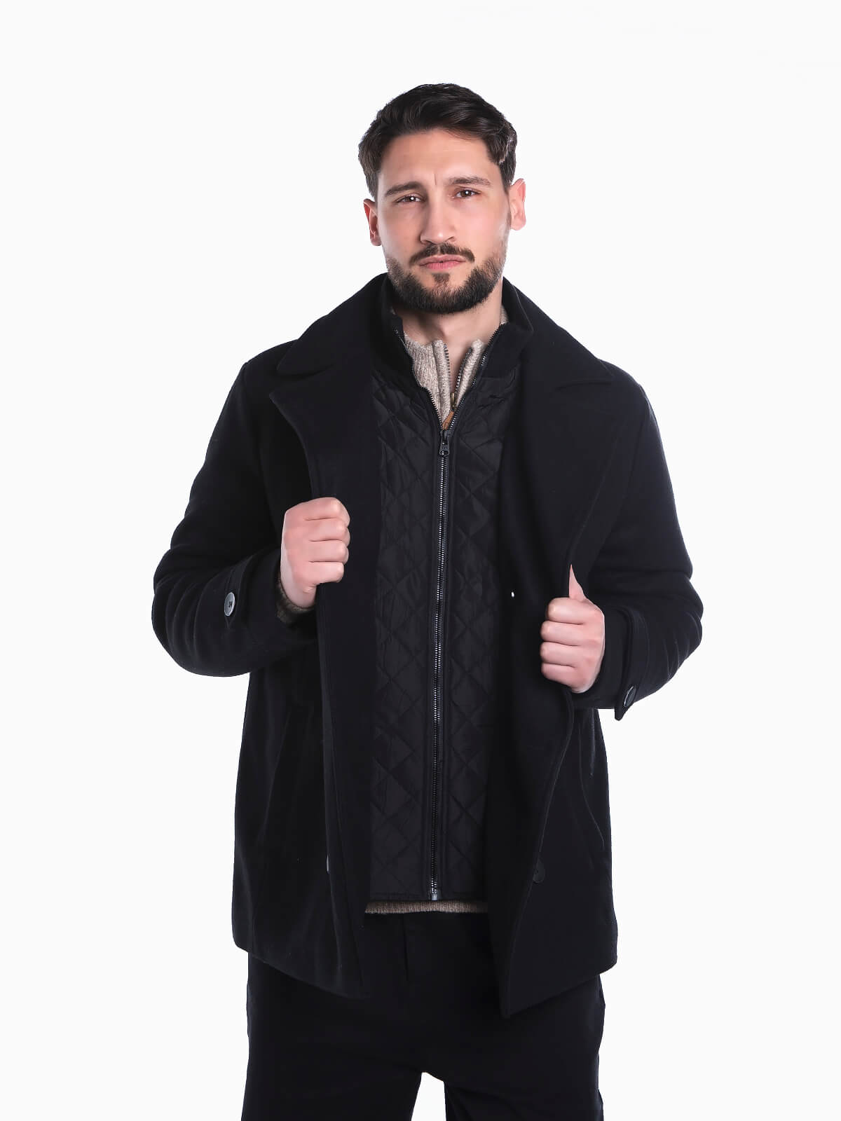 Sobretudo com colarinho de lapela combinado com forro impermeável e gola subida canelada. Sobretudo manga comprida com punhos abotoados. Dois bolsos e um interior. Aperto de fecho éclair e botões.
