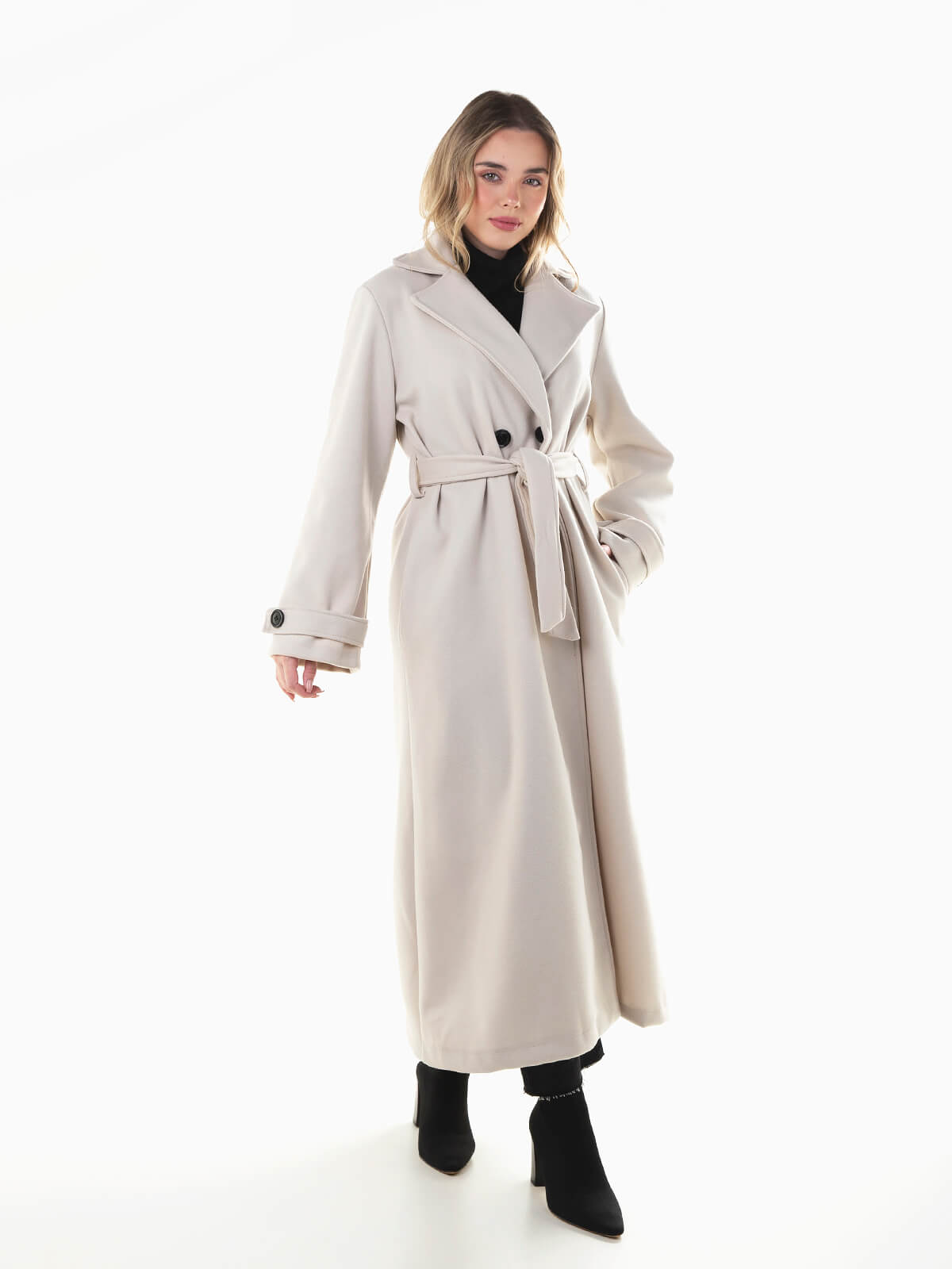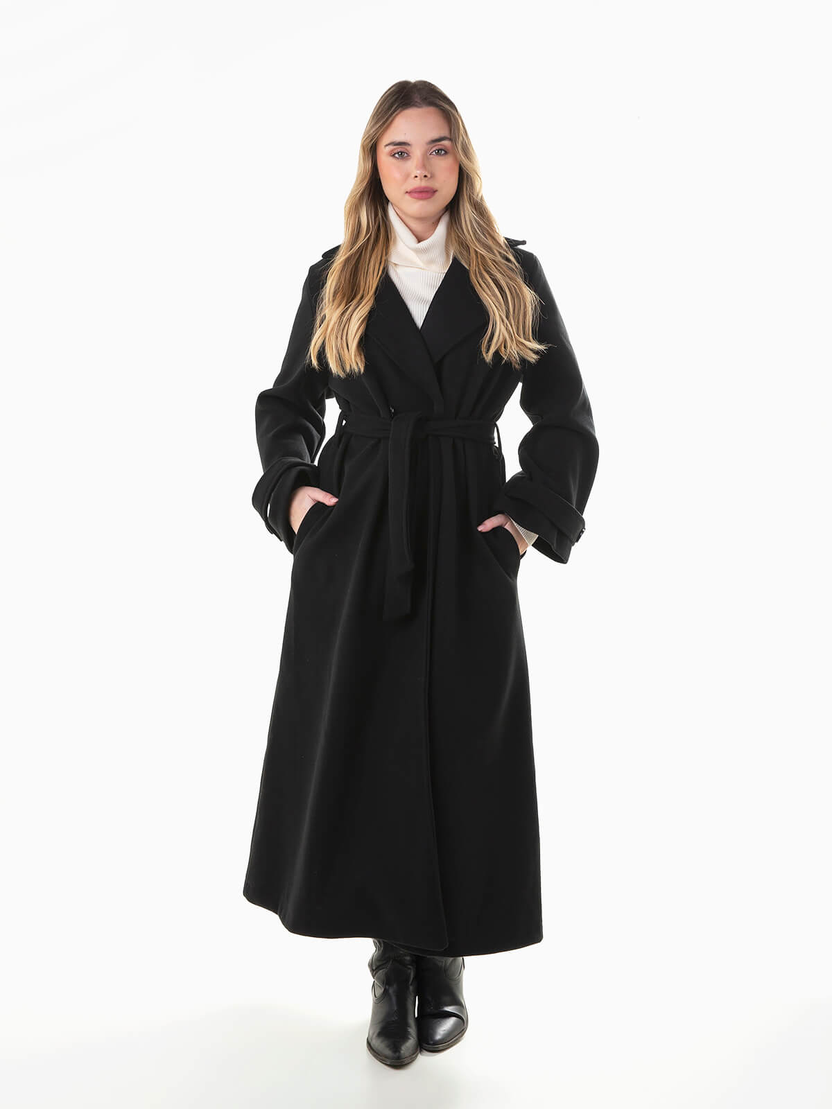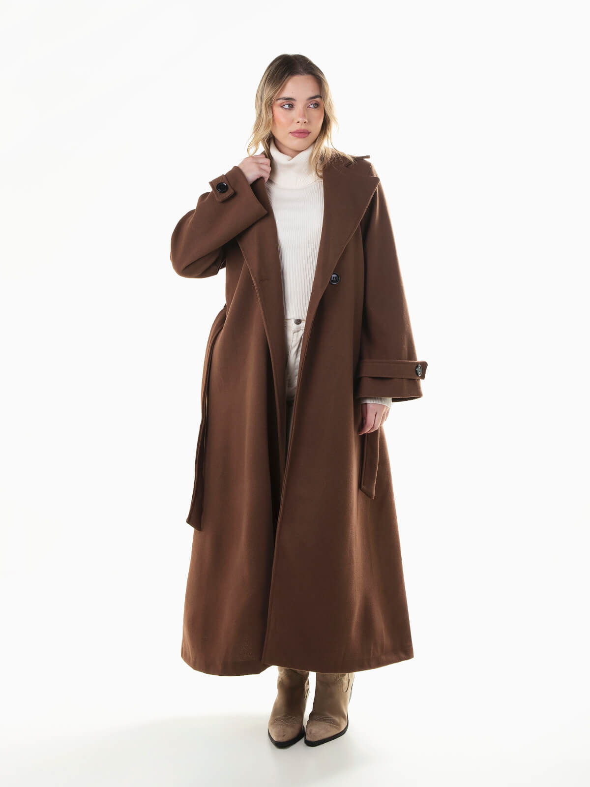 Sobretudo comprido com aperto cruzado de botões. Sobretudo manga comprida com gola abas e cinto para ajustar removível. Fivelas nos punhos. 2 bolsos.