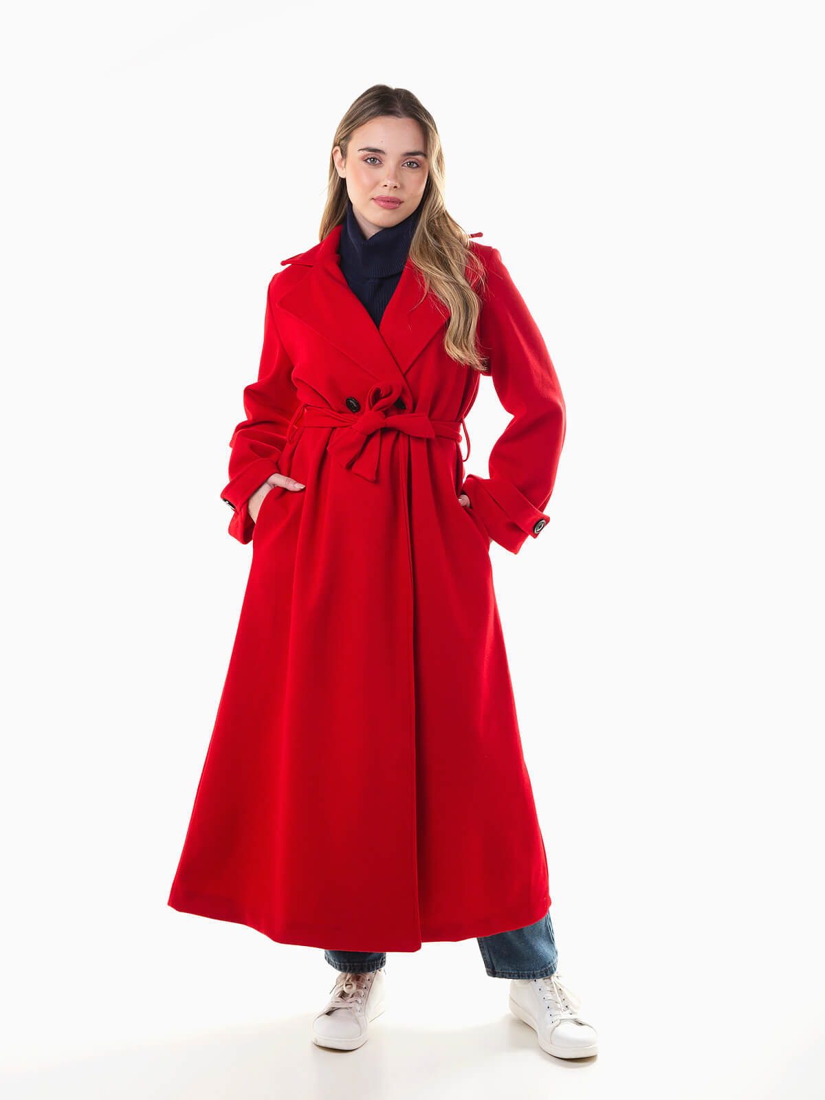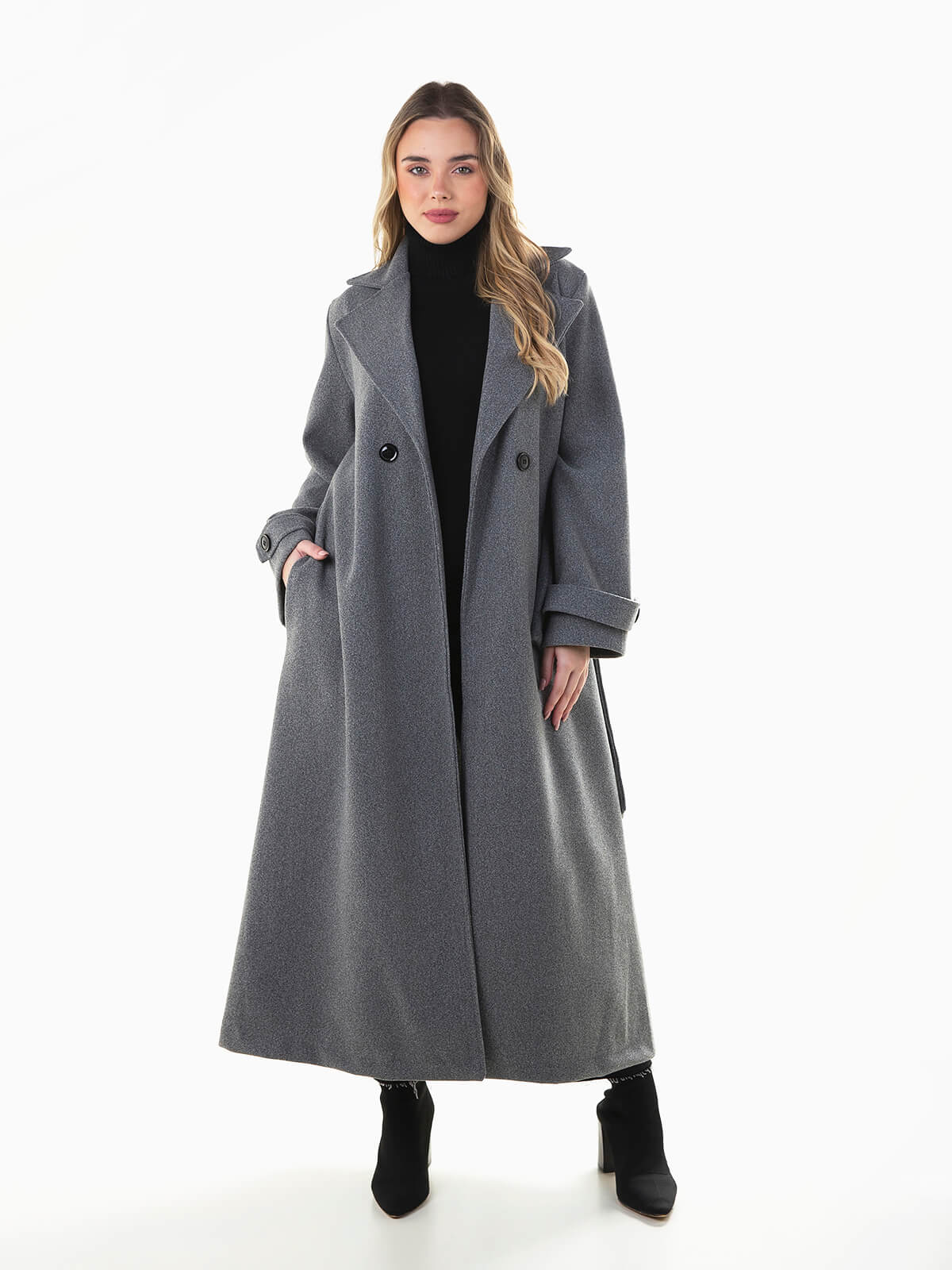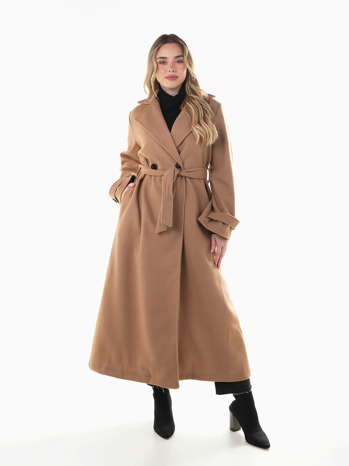 Sobretudo comprido com aperto cruzado de botões. Sobretudo manga comprida com gola abas e cinto para ajustar removível. Fivelas nos punhos. 2 bolsos.