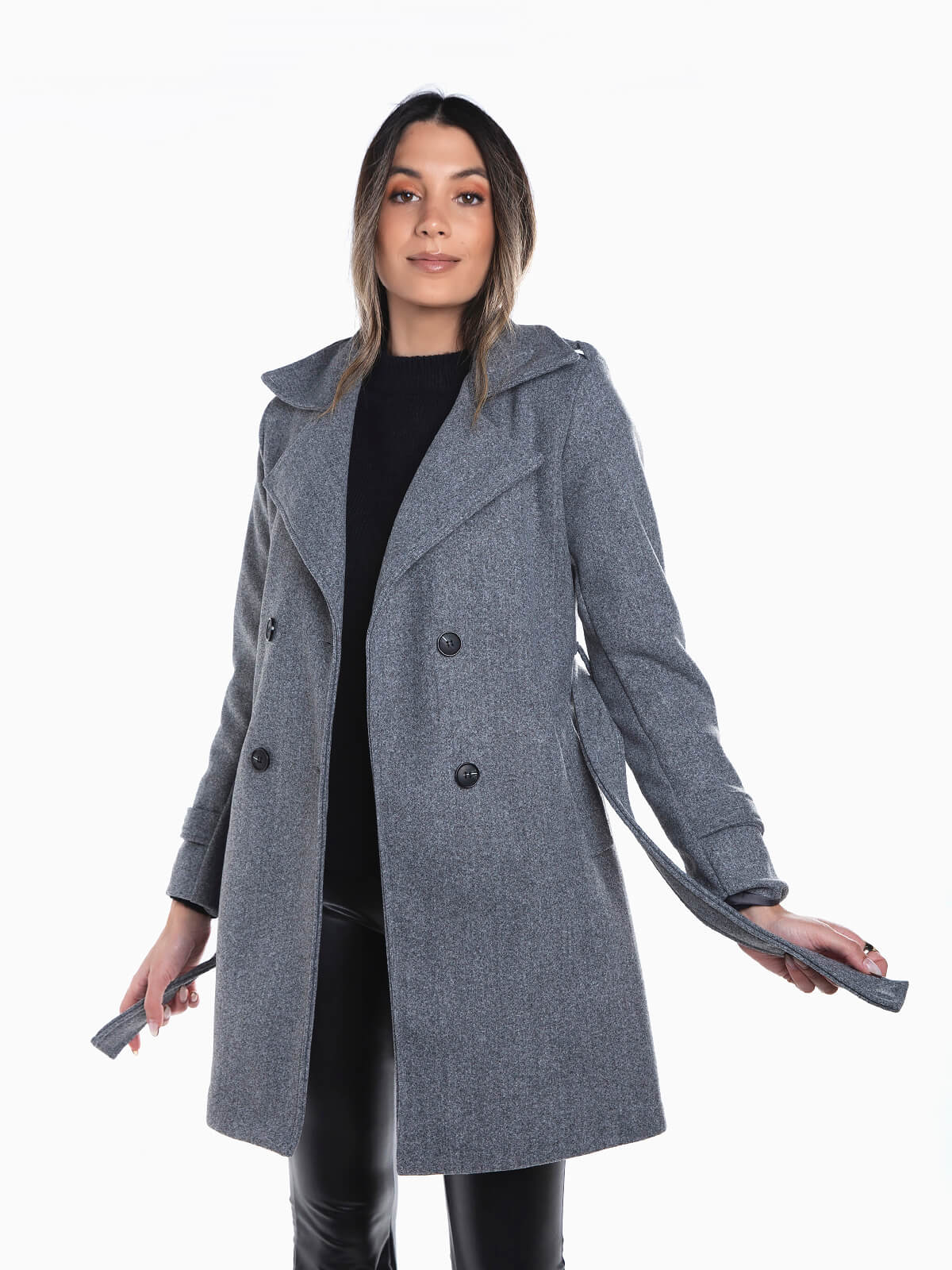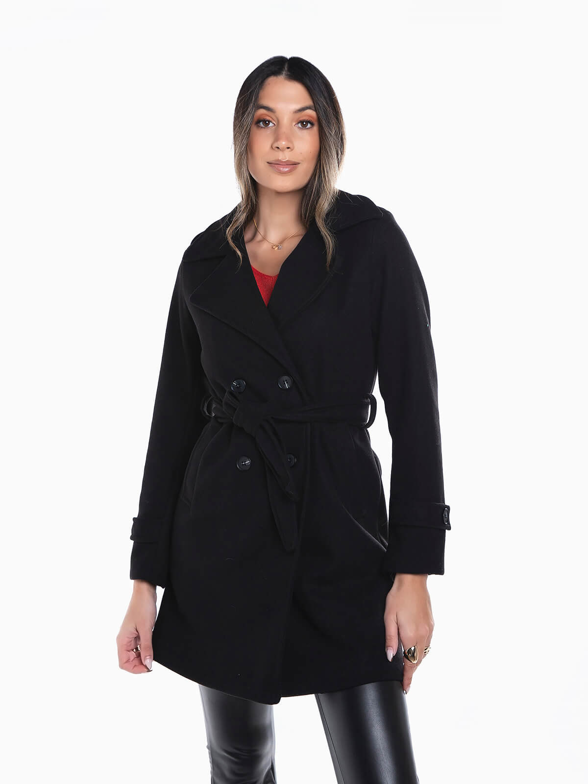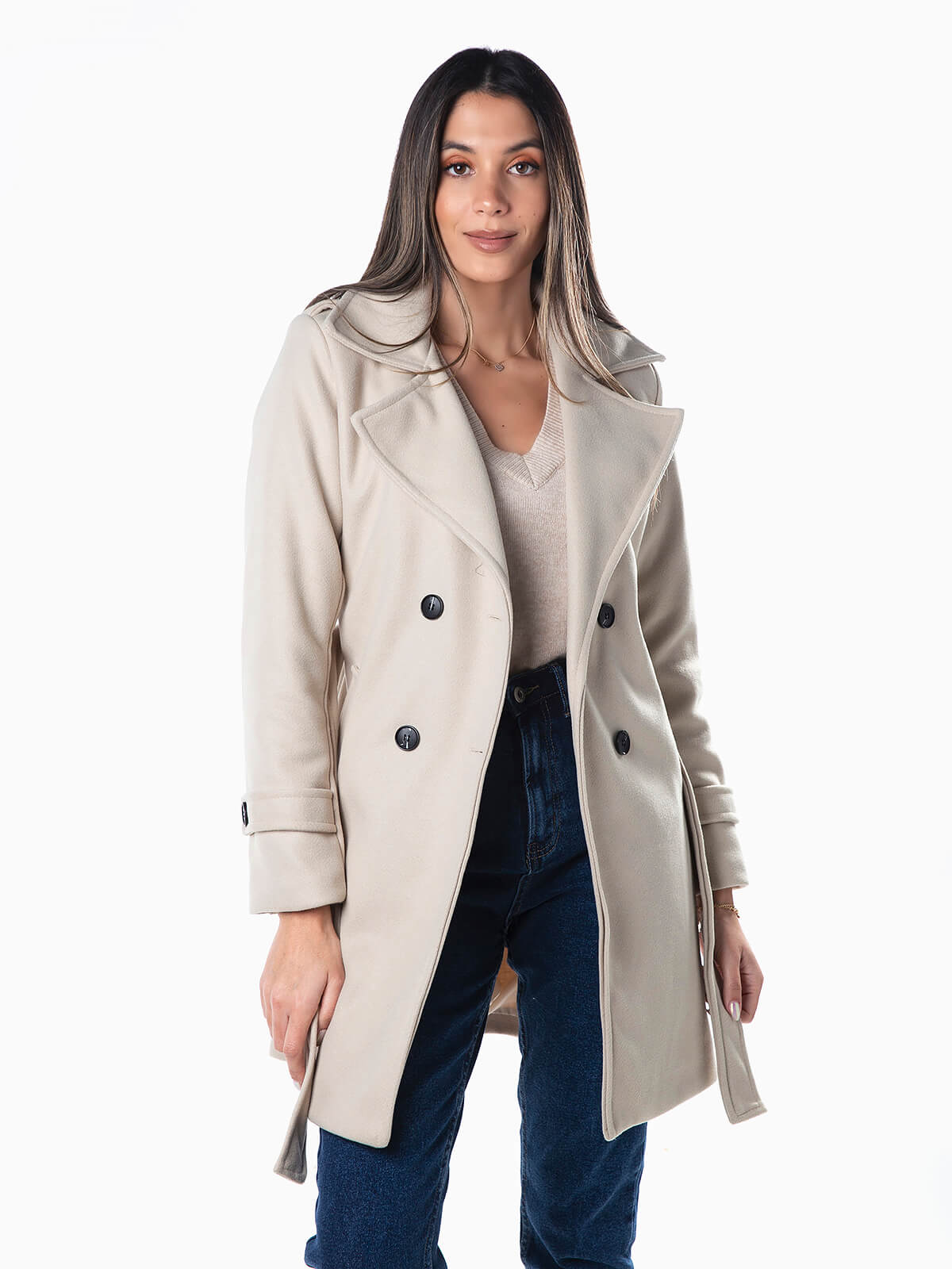 Sobretudo comprido efeito fazenda com cinto removível para senhora. Sobretudo trench manga comprida com gola abas e lapelas. 2 bolsos. Aperto cruzado de botões.