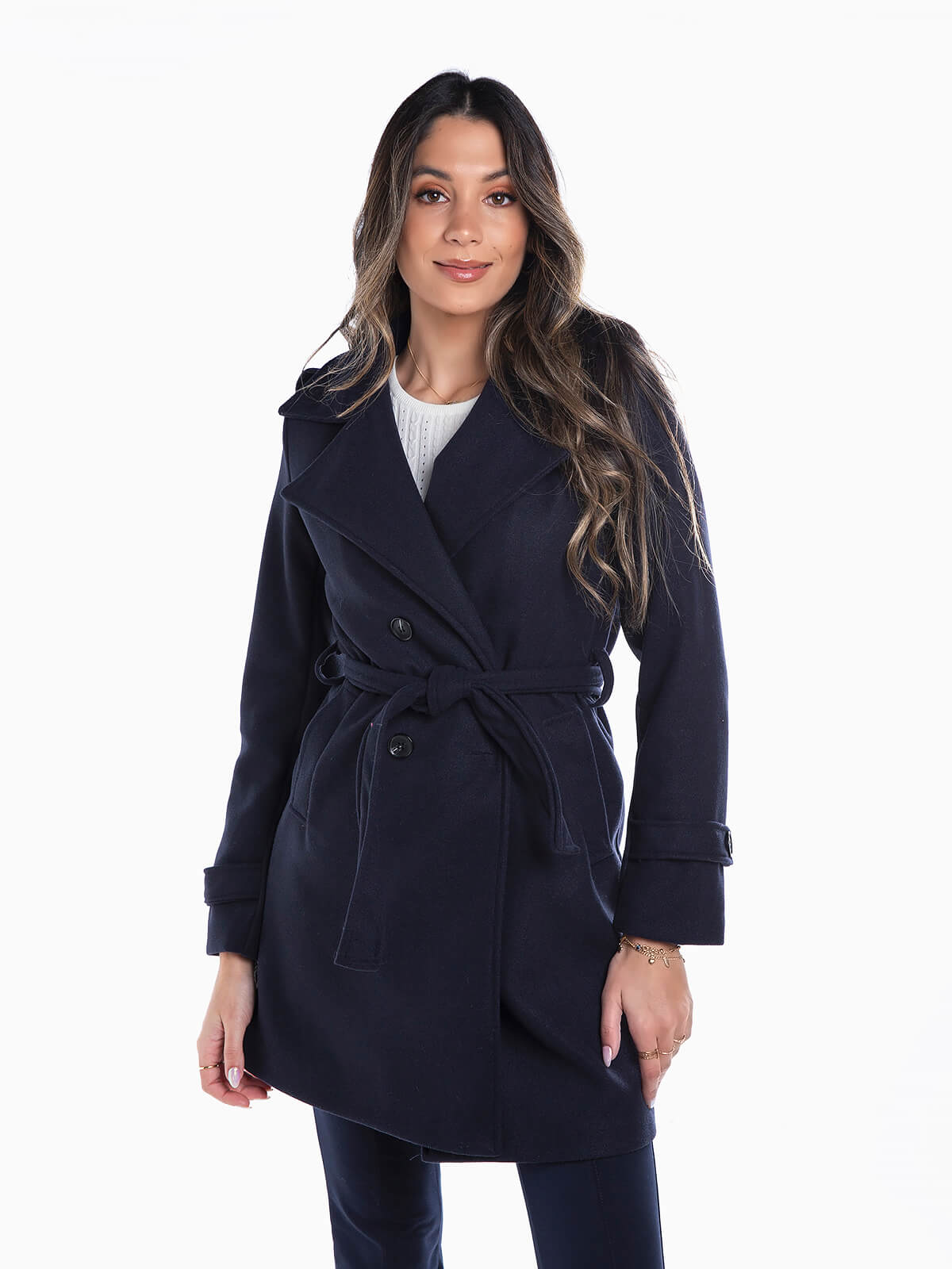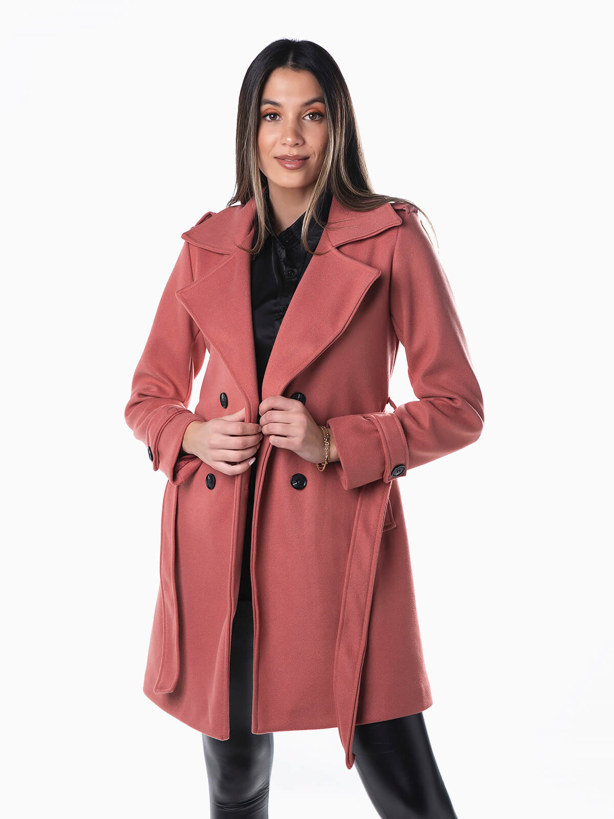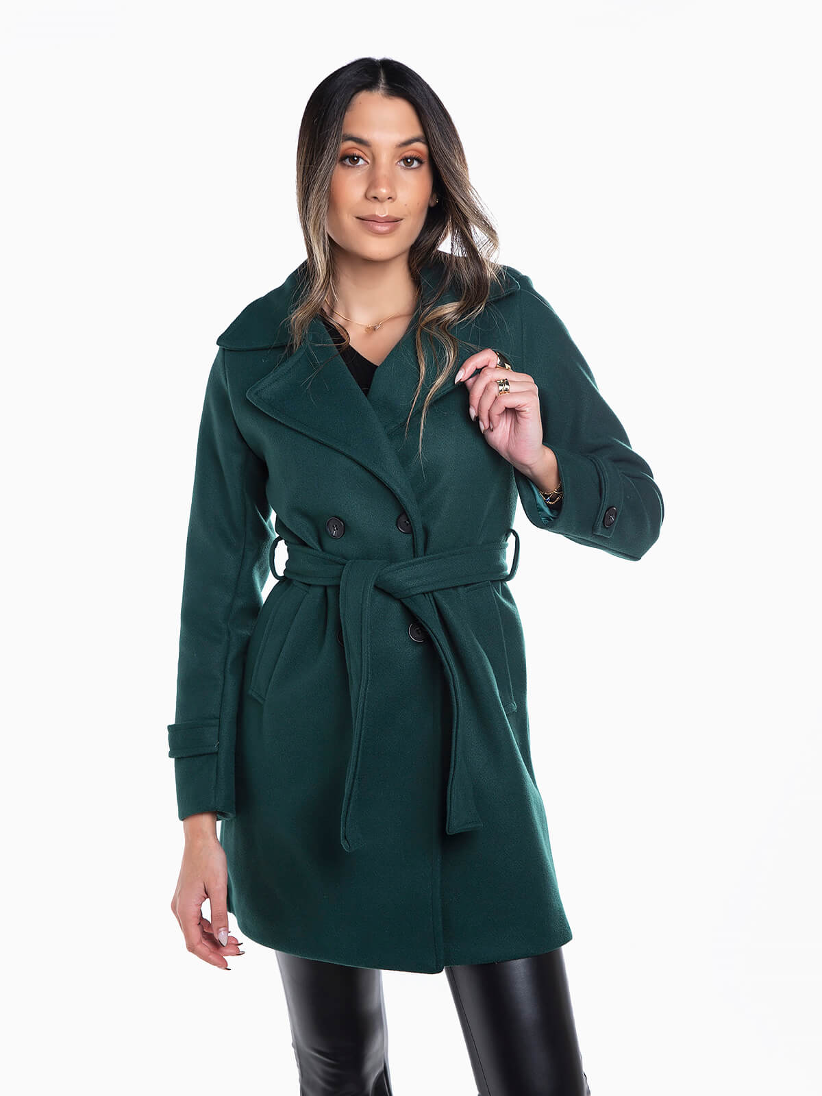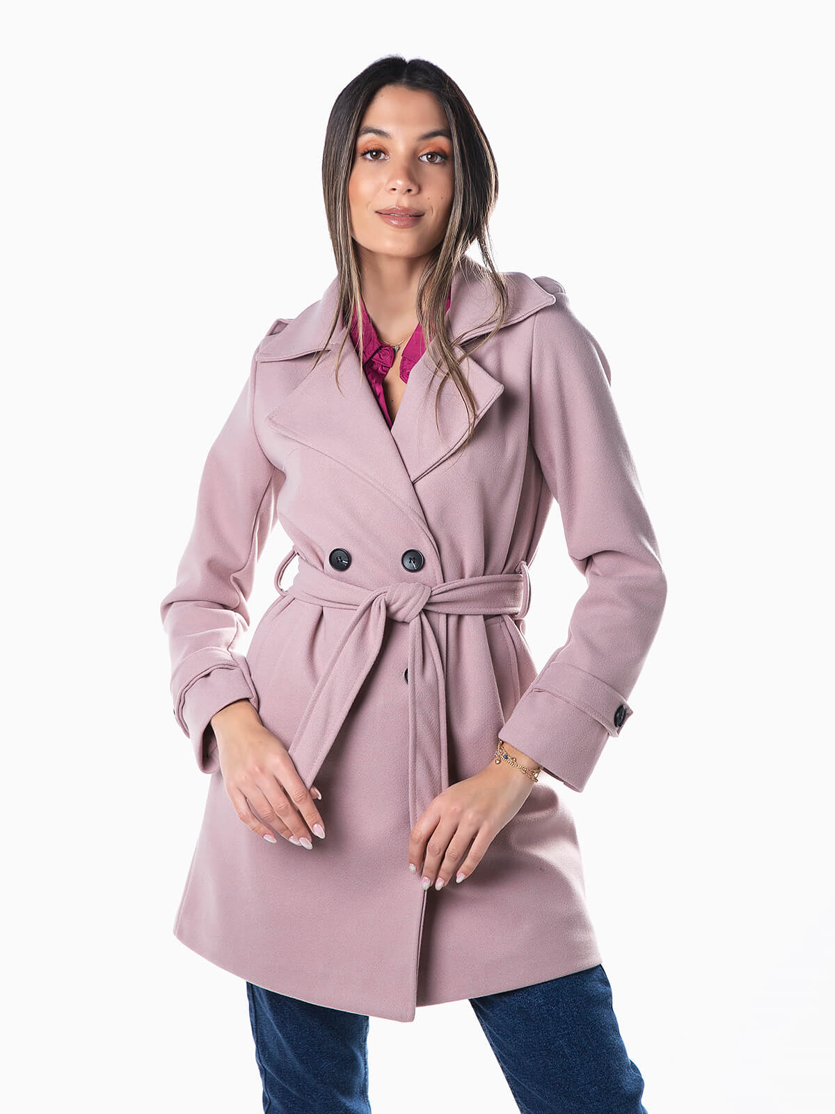 Sobretudo comprido efeito fazenda com cinto removível para senhora. Sobretudo trench manga comprida com gola abas e lapelas. 2 bolsos. Aperto cruzado de botões.