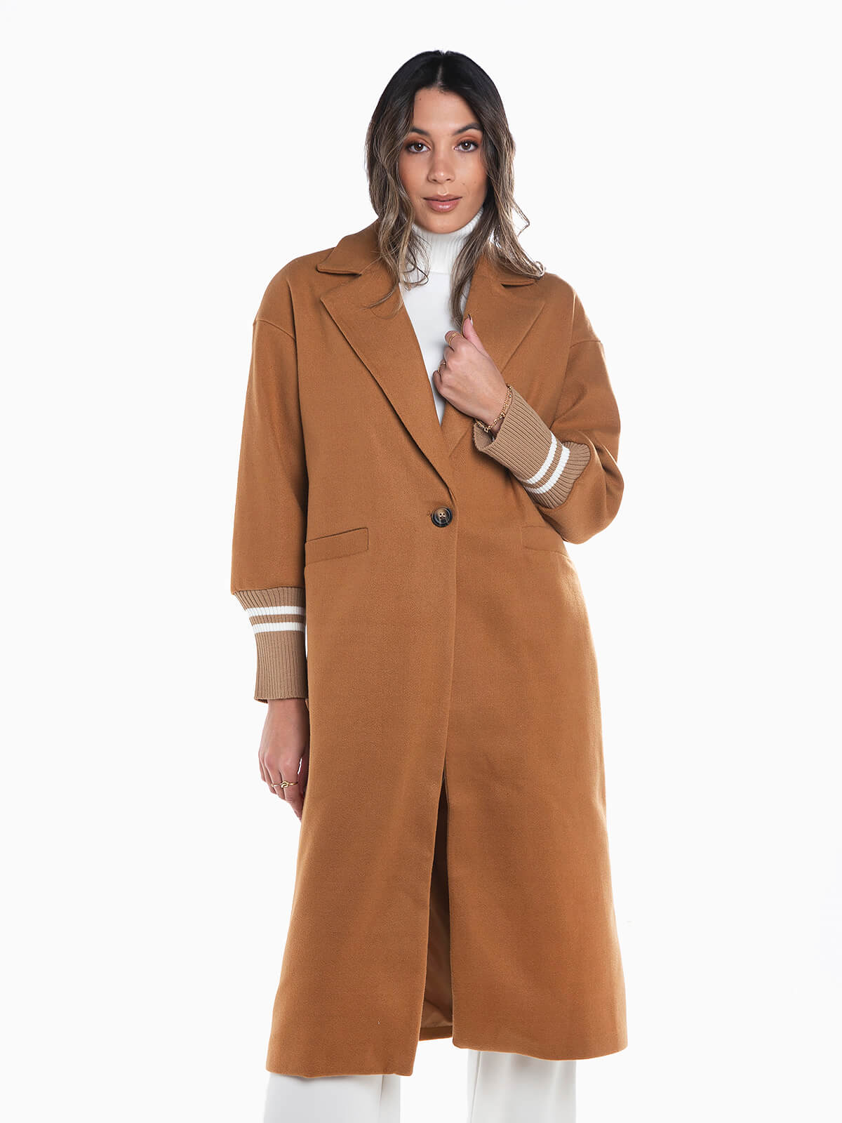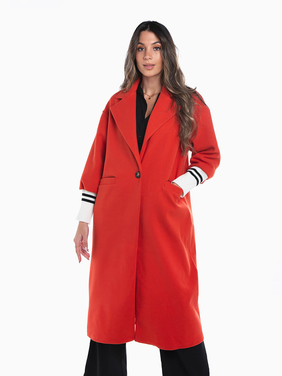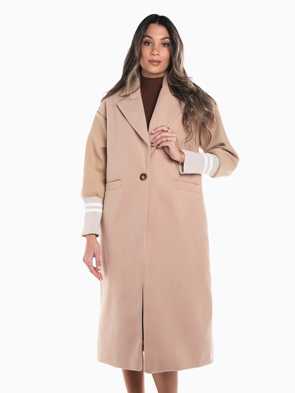 Sobretudo comprido combinado com punhos em malha às riscas. Sobretudo oversize manga comprida com interior forrado e gola abas. 2 bolsos. Aperto de botão.