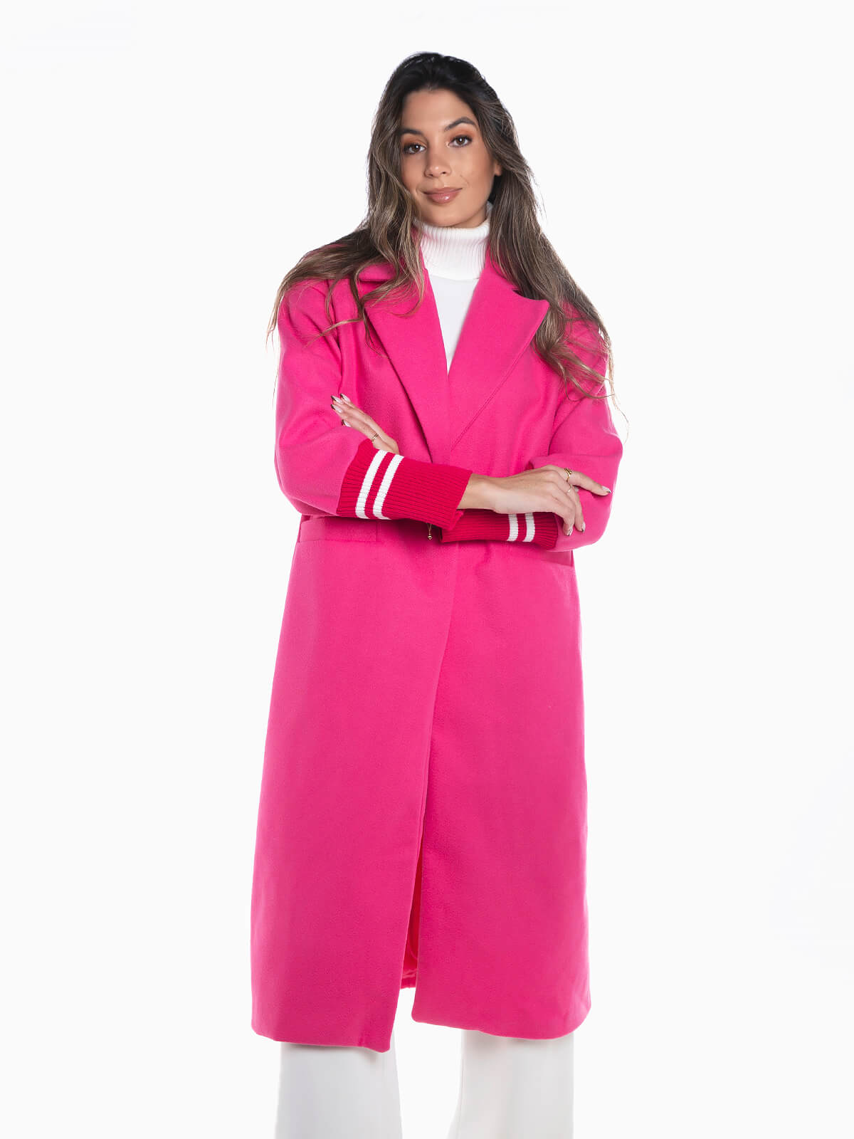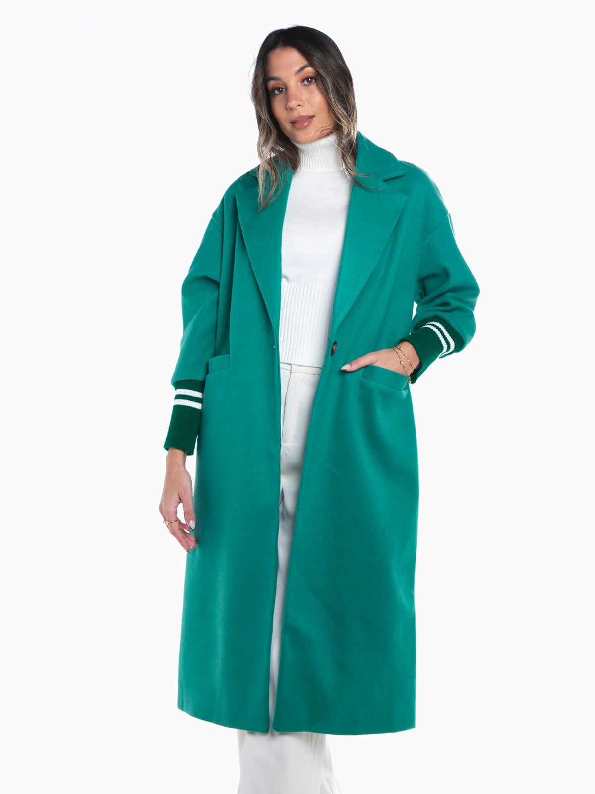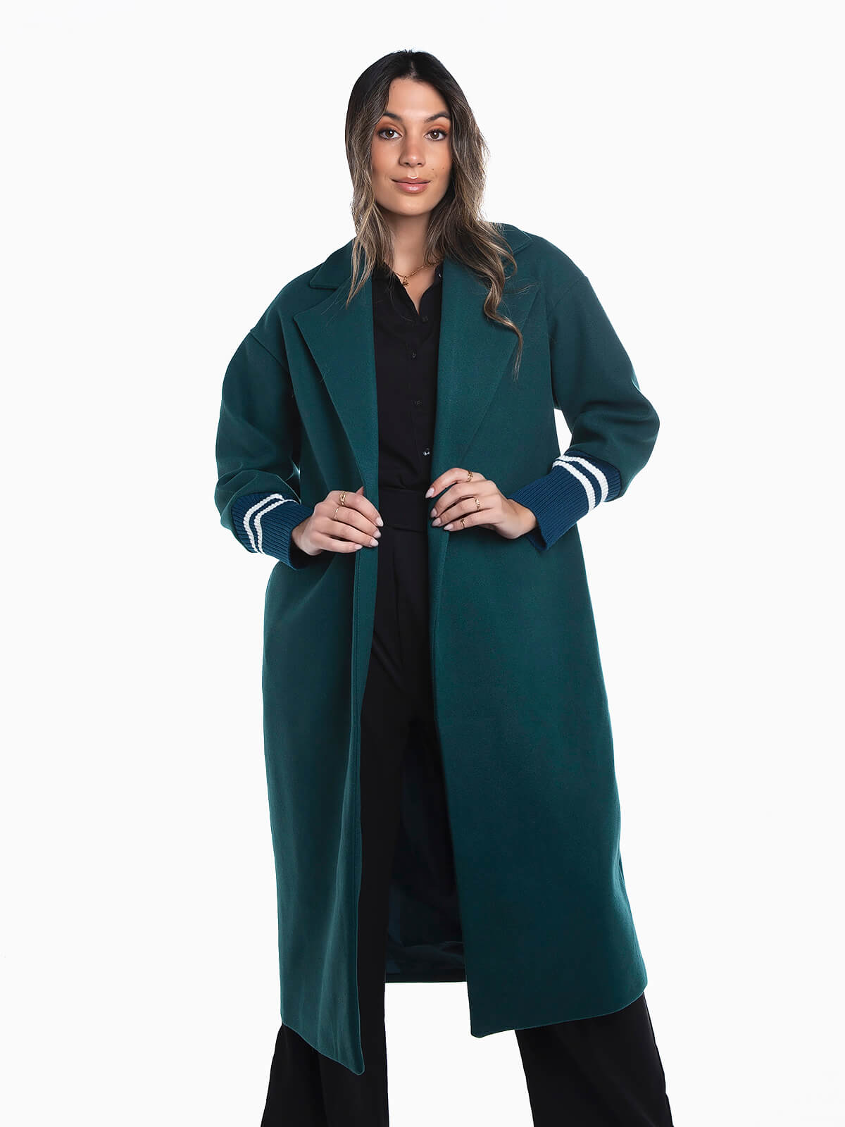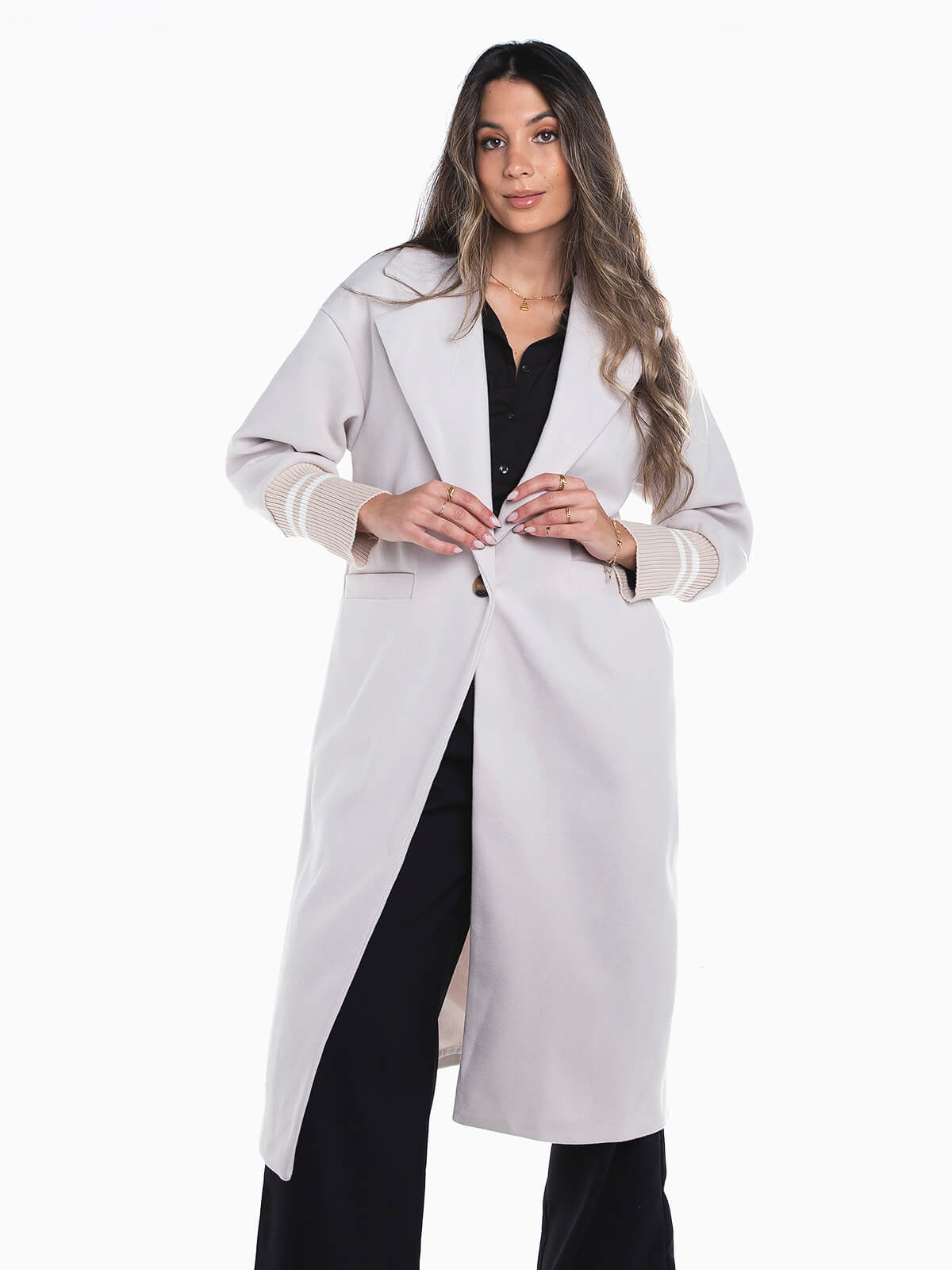 Sobretudo comprido combinado com punhos em malha às riscas. Sobretudo oversize manga comprida com interior forrado e gola abas. 2 bolsos. Aperto de botão.