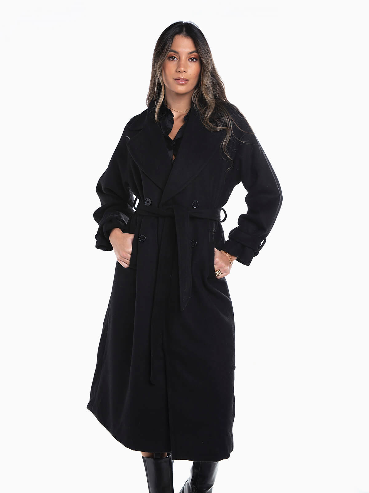 Sobretudo comprido em tecido mistura de lã para maior conforto térmico. Sobretudo trench com cinto removível para ajustar. 2 bolsos. Interior forrado. Gola abas e lapelas. Aperto cruzado de botões.