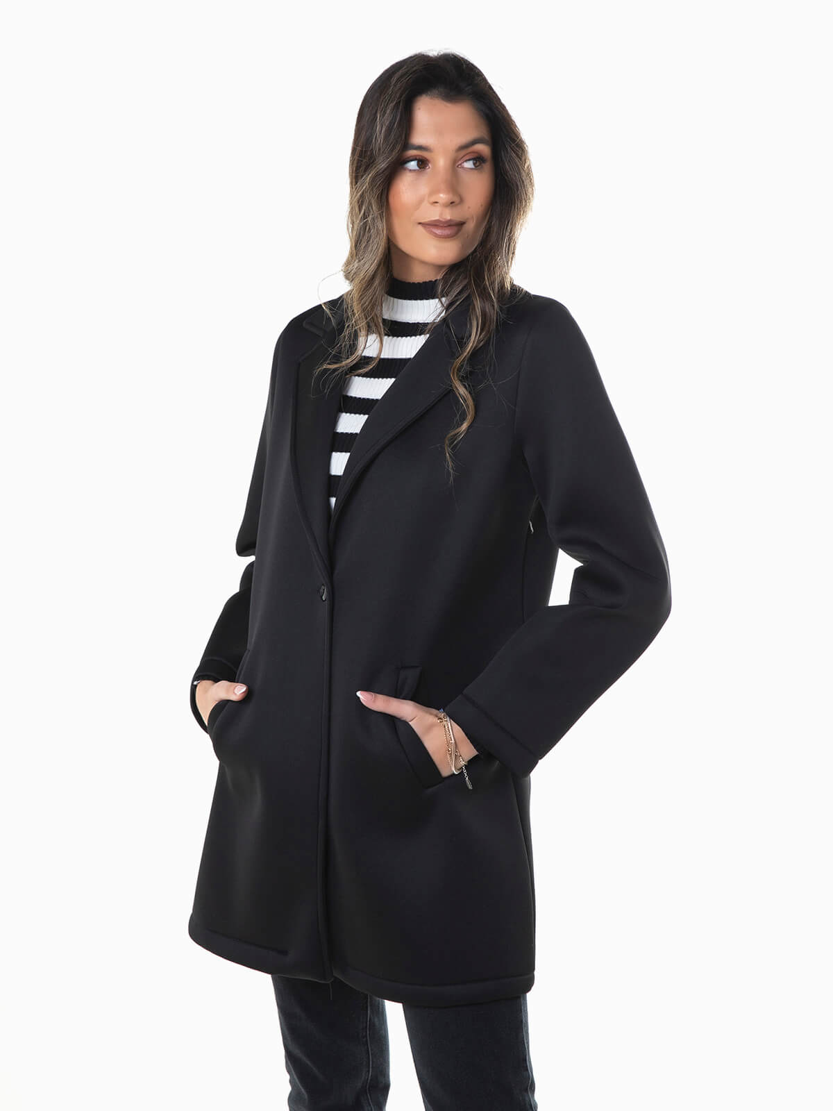 Sobretudo comprido em tecido técnico neoprene para maior conforto térmico. Casaco manga comprida com gola de abas e lapelas. 2 bolsos. Aperto de botão.