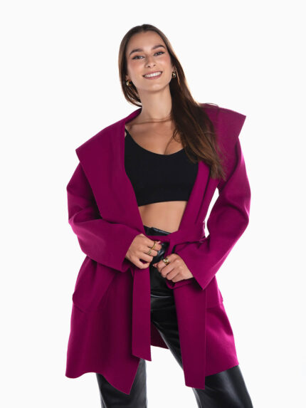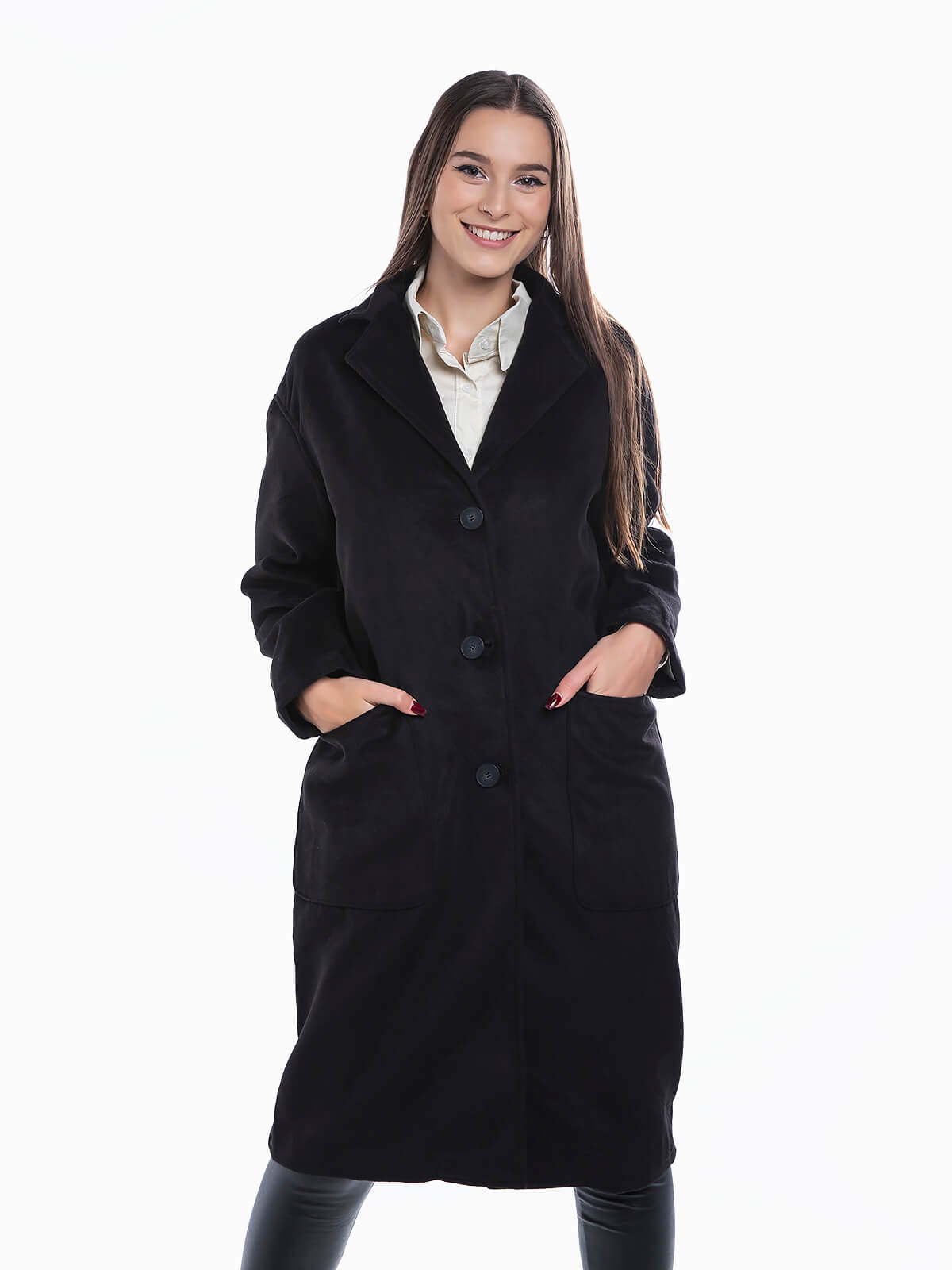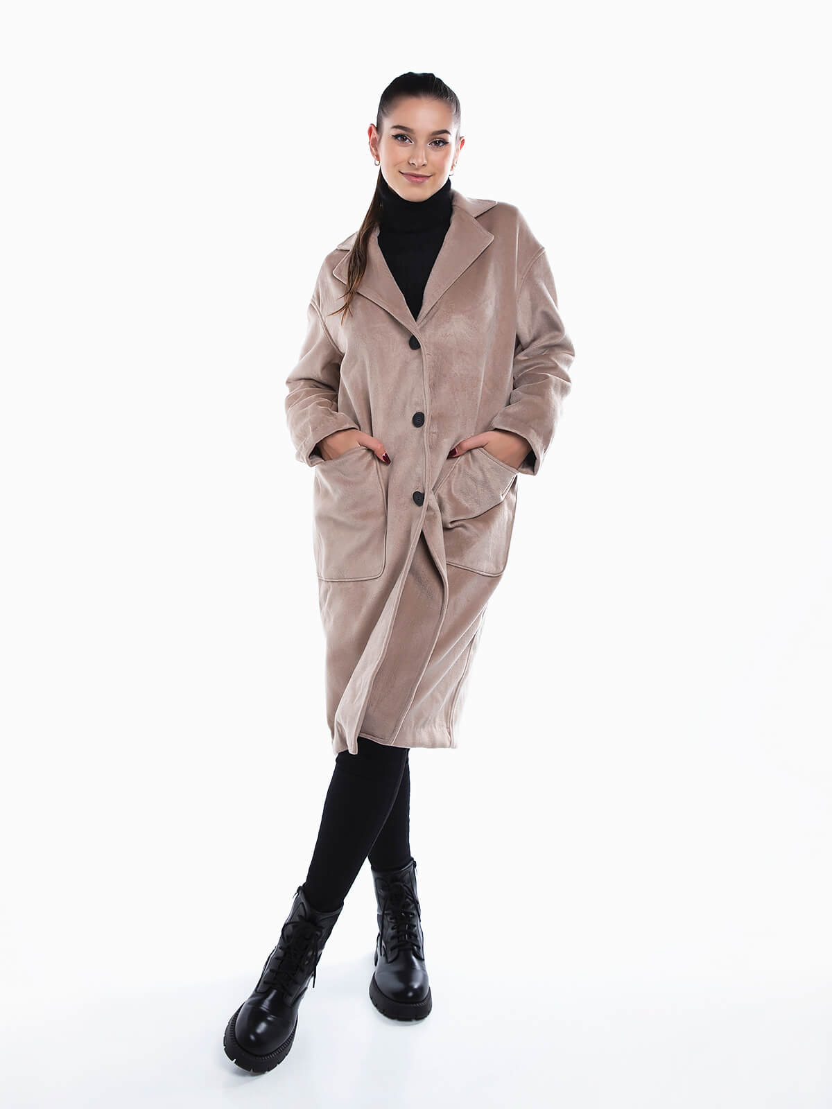 Sobretudo comprido em pele de pêssego para senhora. Sobretudo com bolsos na frente. Gola com lapelas. Ombros descaídos. Aperto de botões.