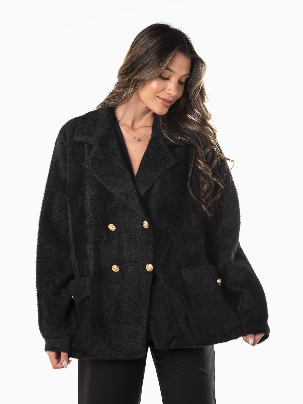 Sobretudo efeito pelo curto com aperto cruzado de botões dourados. Sobretudo manga comprida com gola abas e lapelas. 2 bolsos.