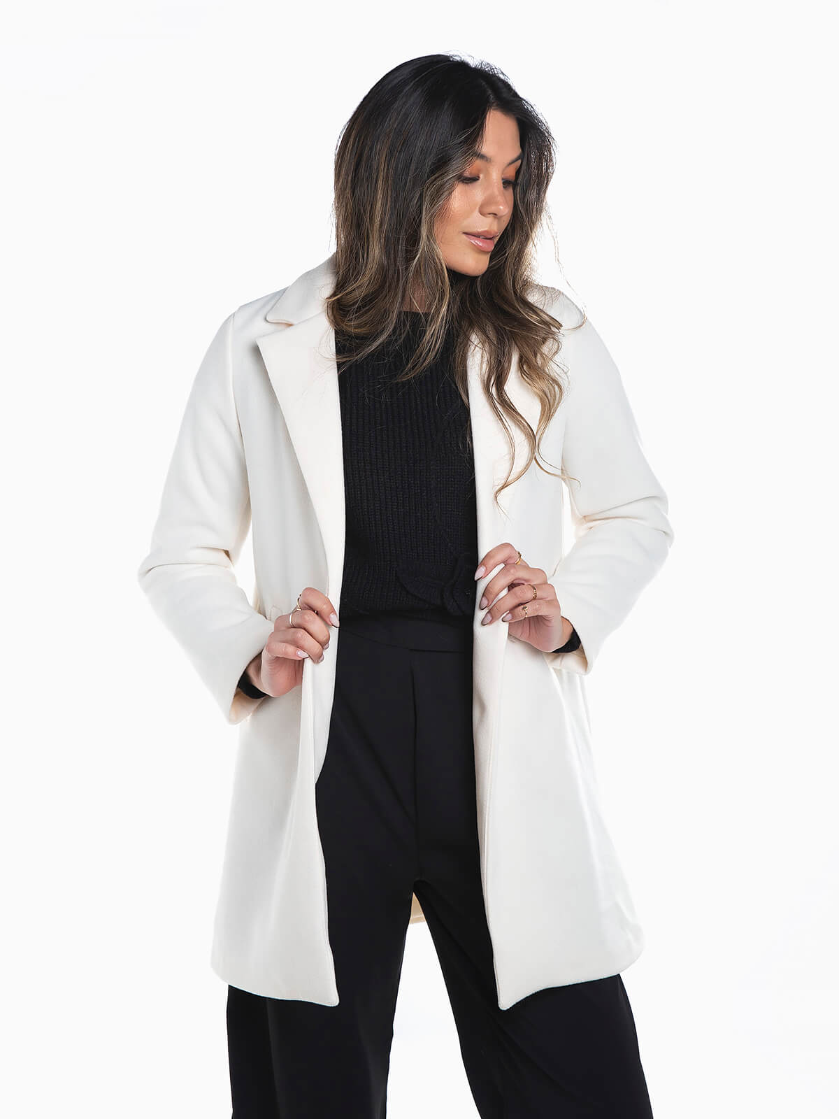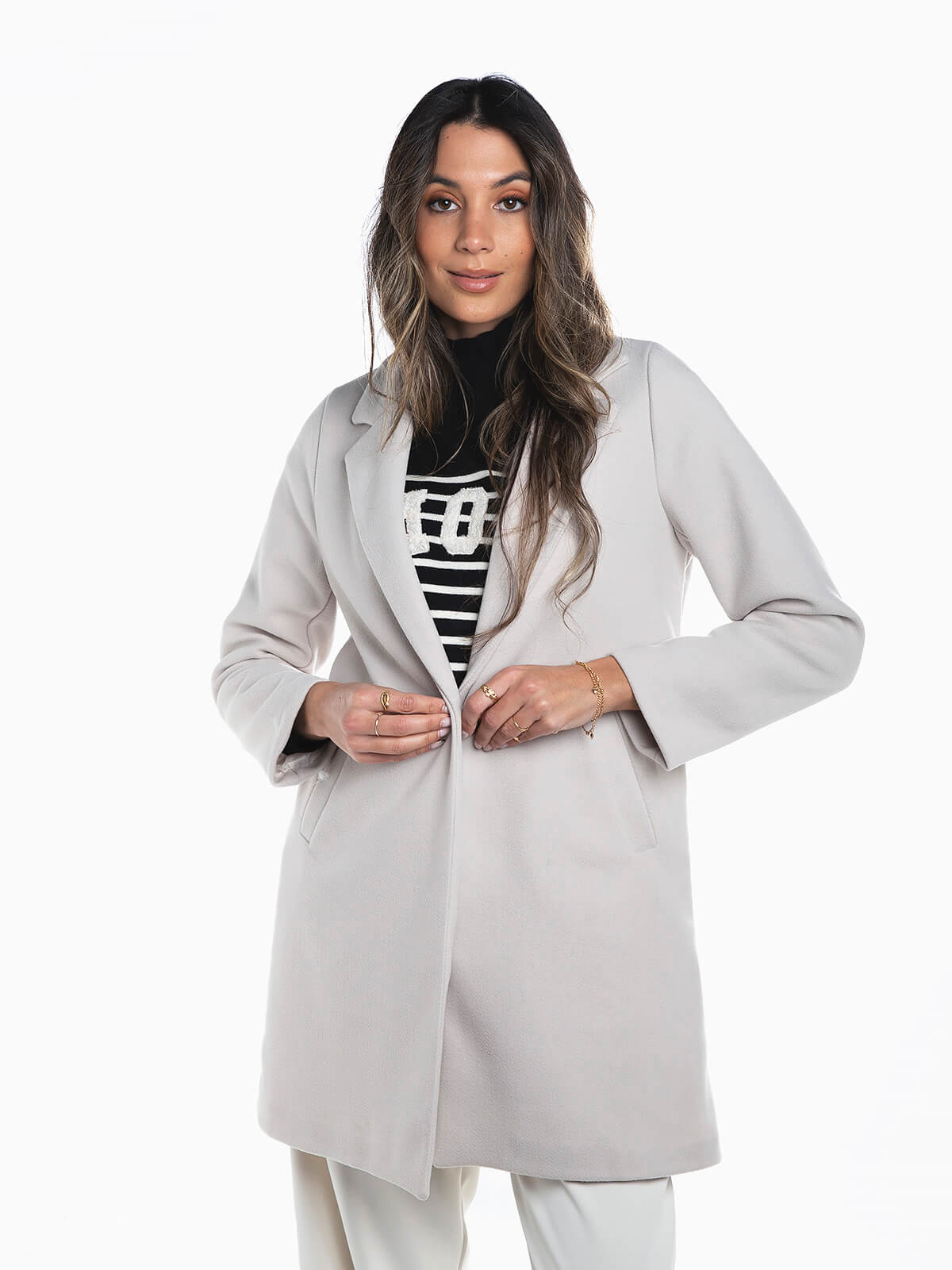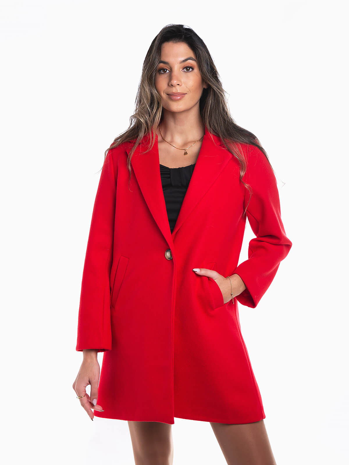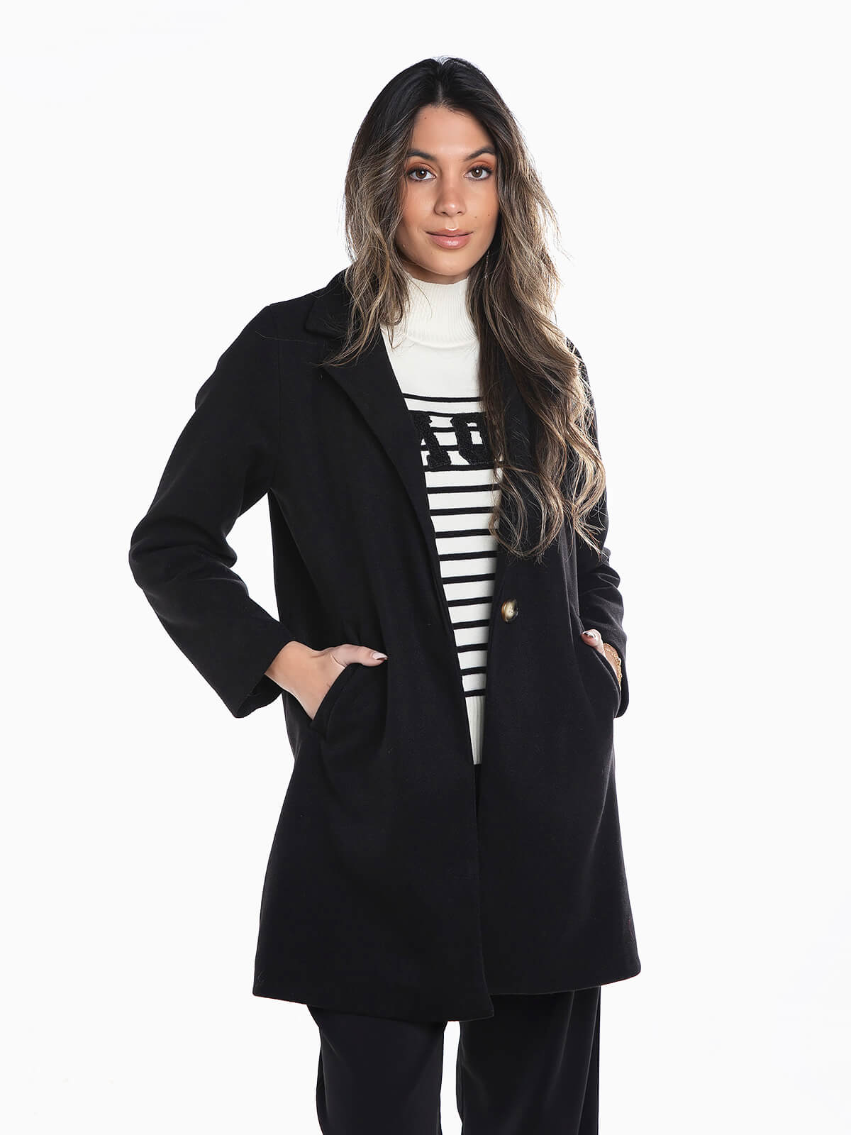 Sobretudo fazenda com aperto de botão para senhora. Sobretudo manga comprida com interior forrado e 2 bolsos. Gola abas e lapelas.