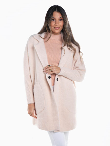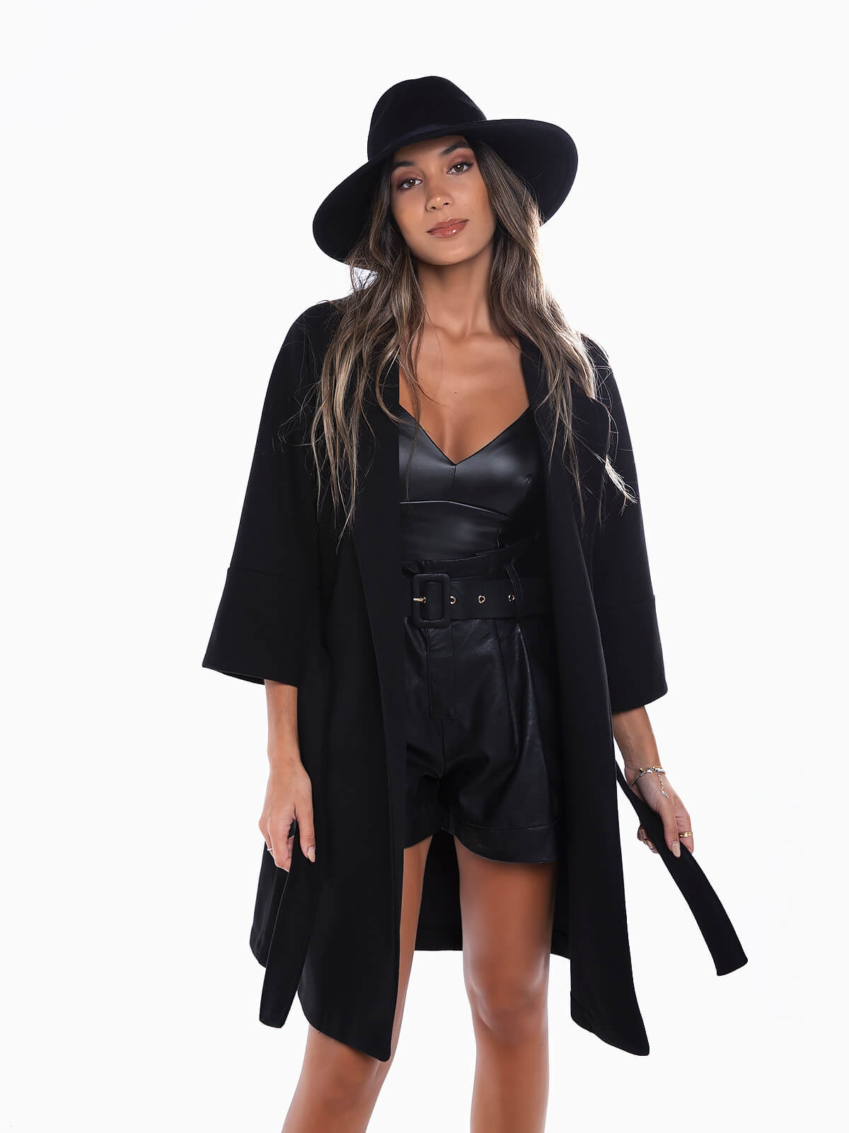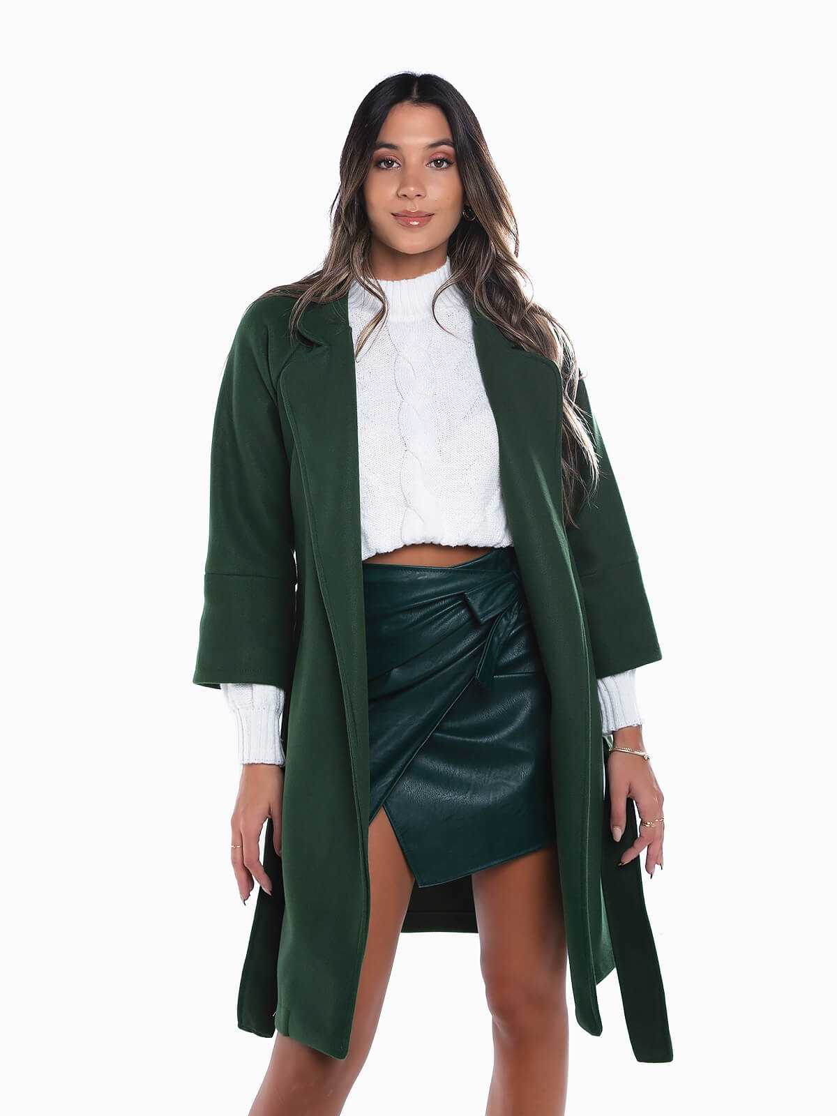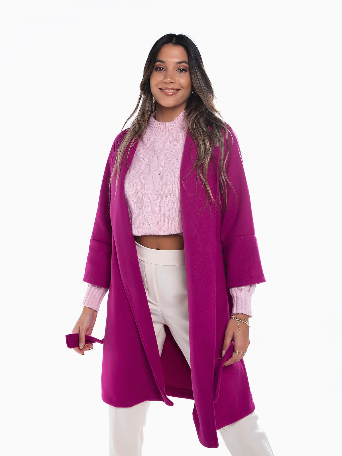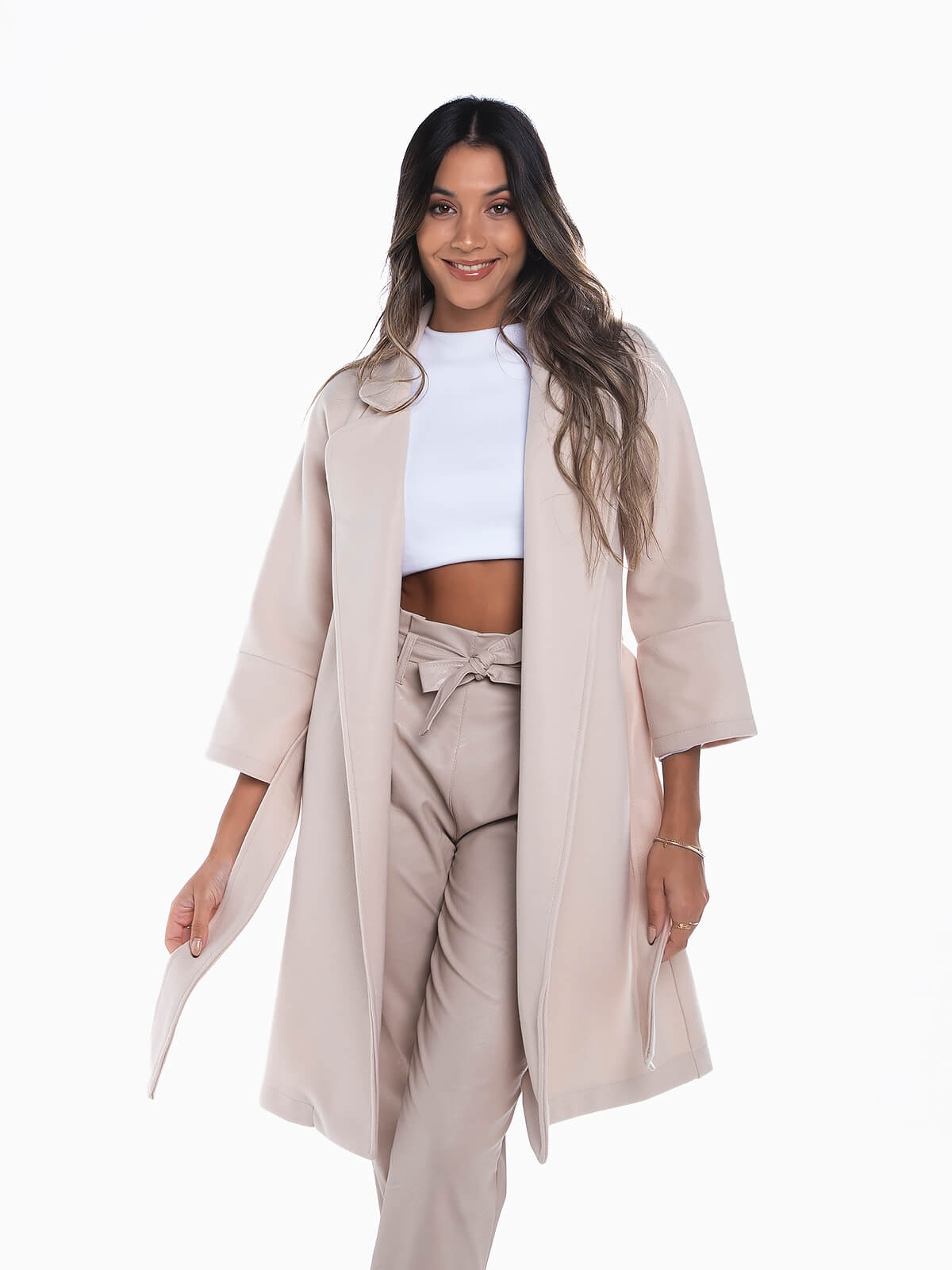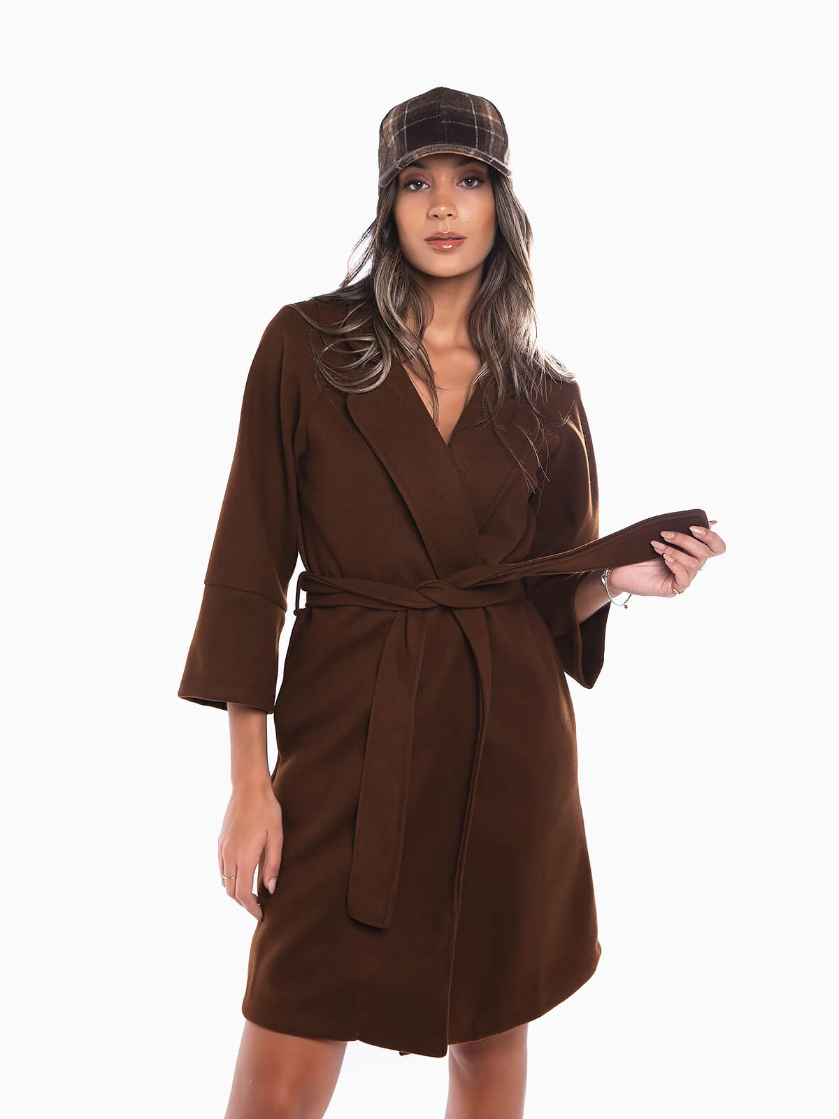 Sobretudo fazenda comprido com cinto para atar. Casaco com manga 3/4 e gola de lapela. 2 bolsos.
