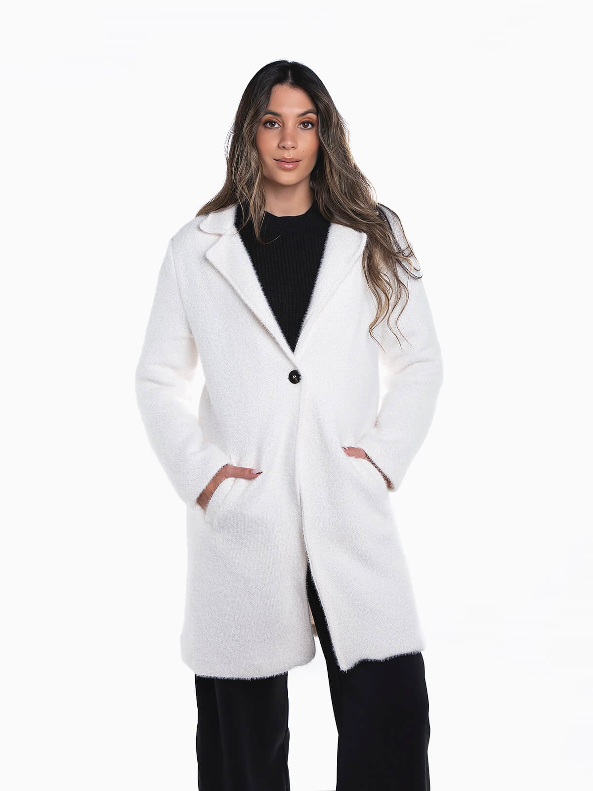 Sobretudo pérola comprido de pelo suave para senhora. Sobretudo manga comprida com interior forrado. 2 bolsos. Gola abas. Aperto de botão.
