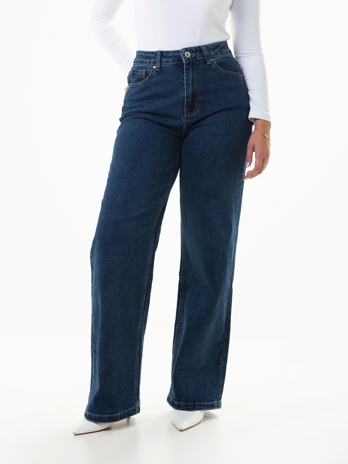 Straight jeans com lavagem azul escuro para senhora. Calças ganga wide fit de cintura alta com 5 bolsos. Aperto fecho éclair e botão.