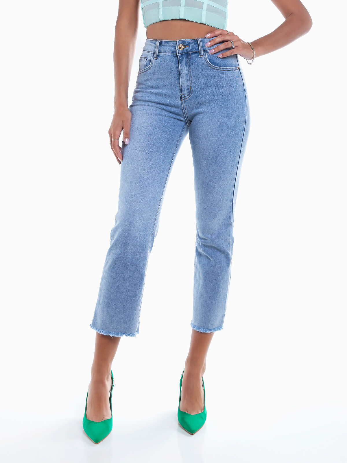 Straight jeans com base desfiada para senhora. Calças de ganga de cintura alta com lavagem azul claro. 5 bolsos. Aperto de fecho éclair e botão.