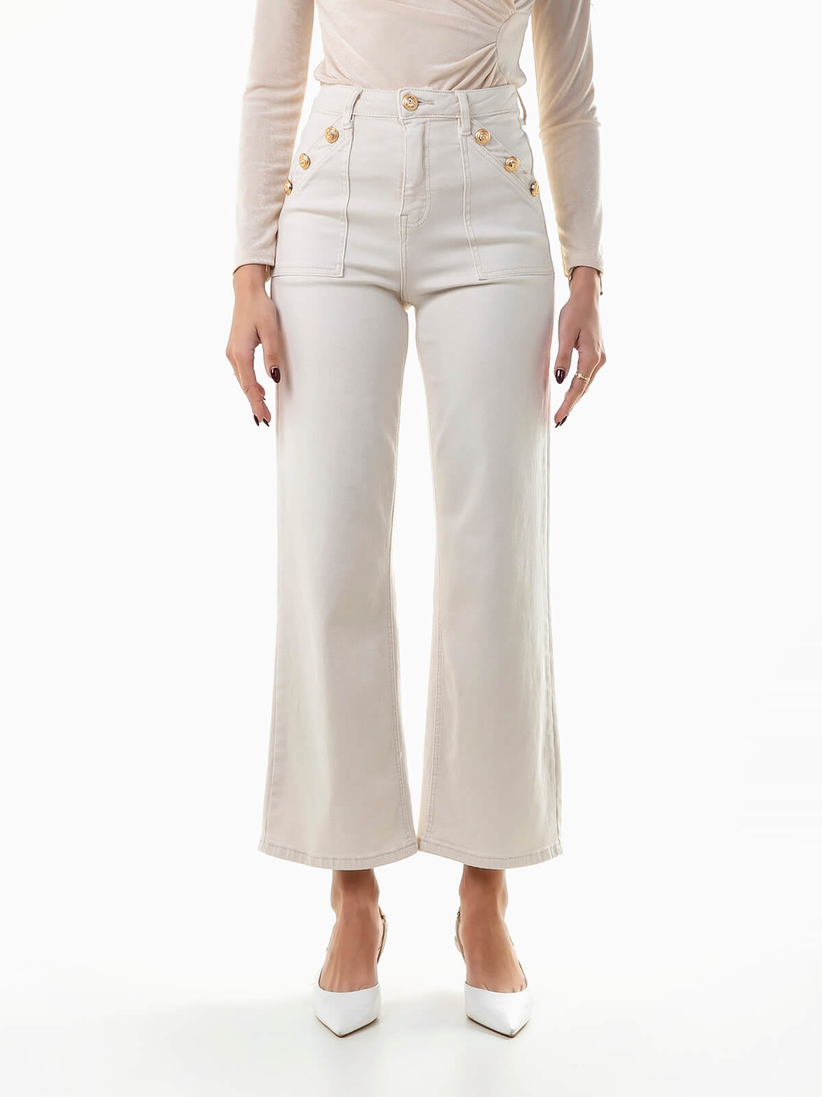 Straight jeans bege claro com cintura alta. Calças ganga elástica com botões dourados decorativos. 4 bolsos. Aperto de fecho éclair e botão.