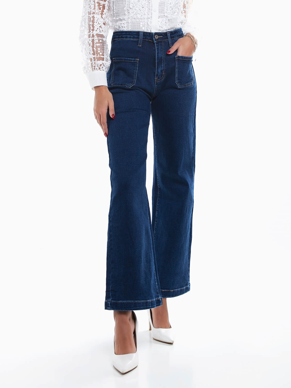 Straight jeans com 2 bolsos quadrados à frente. Calças ganga largas com cintura alta. Lavagem azul escuro. Aperto fecho zíper e botão.