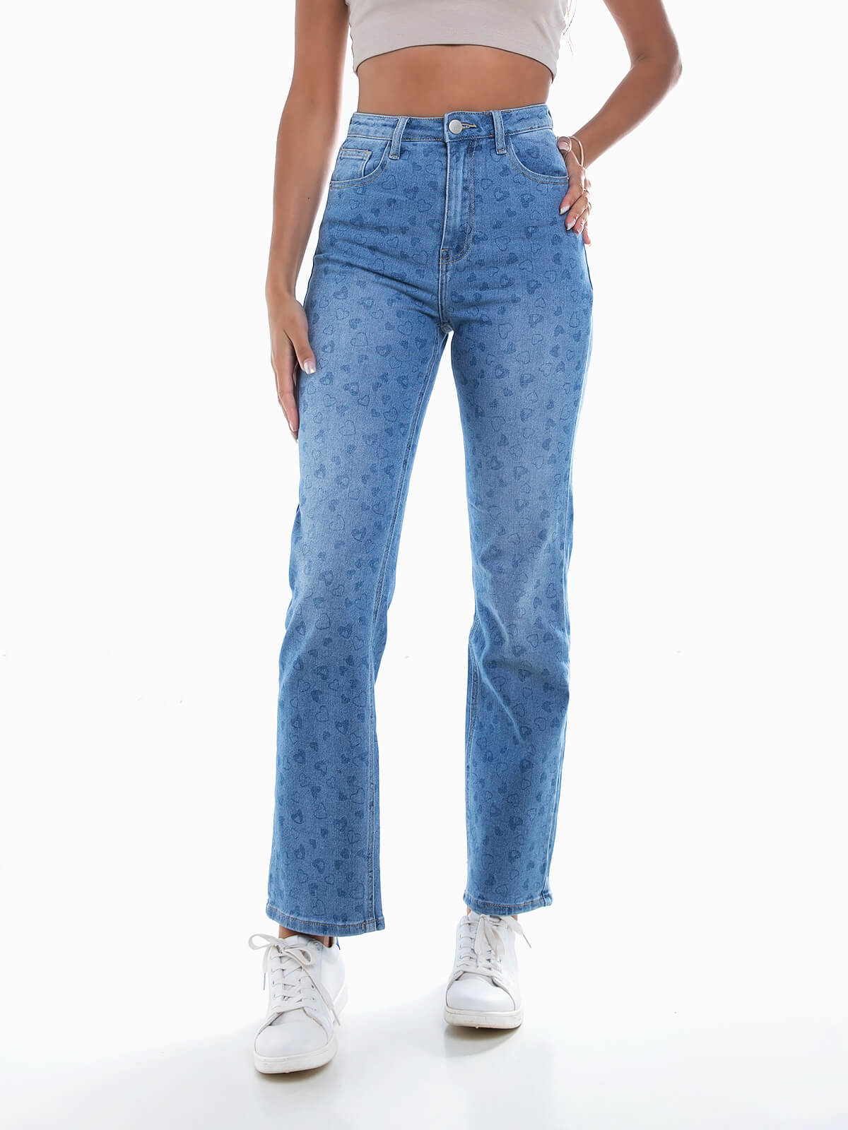 Straight jeans com estampado de corações. Calças de ganga de cintura alta elástica. Lavagem azul claro. 5 bolsos. Aperto de fecho éclair e botão.