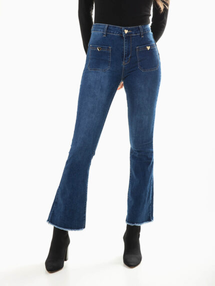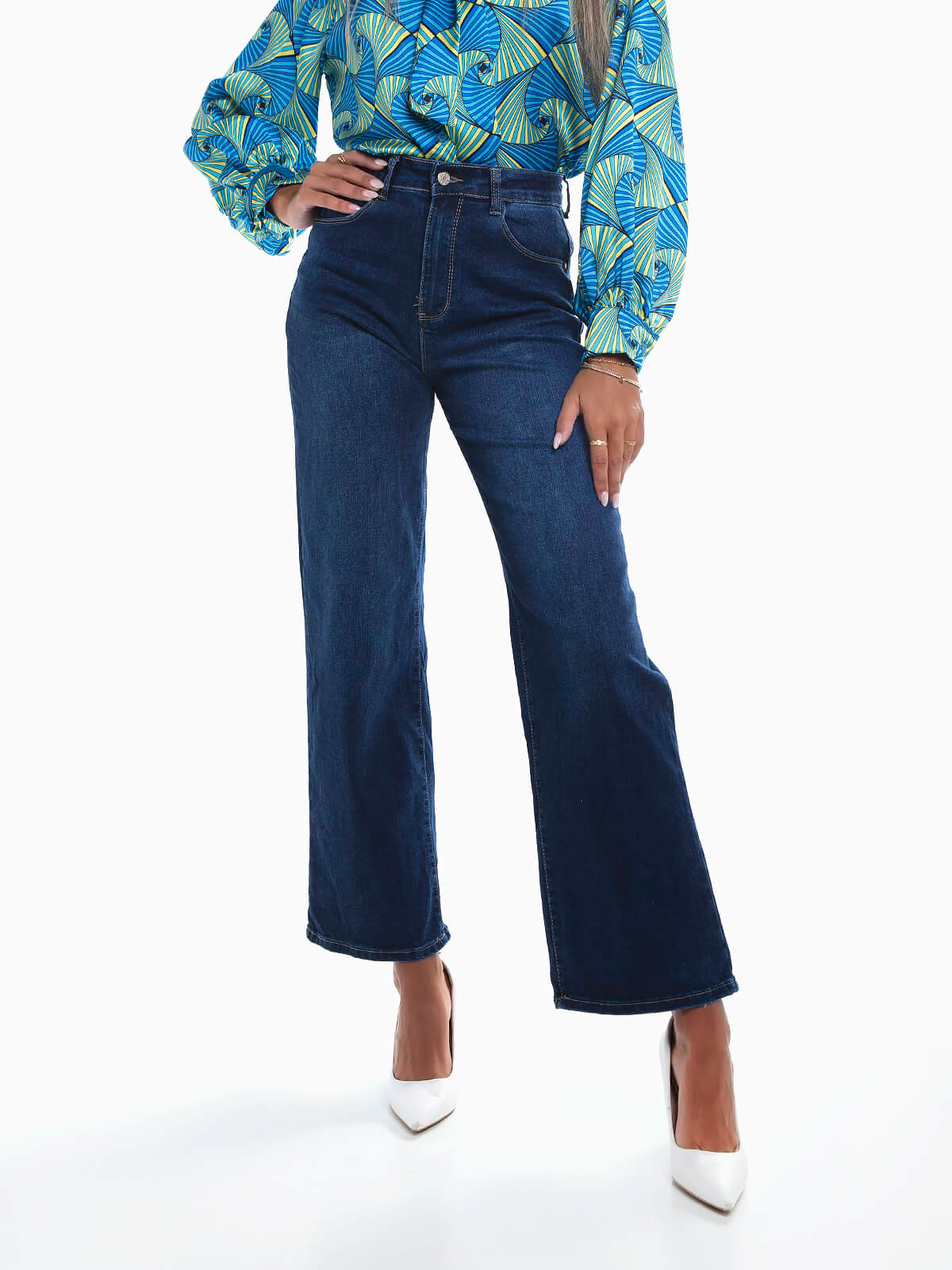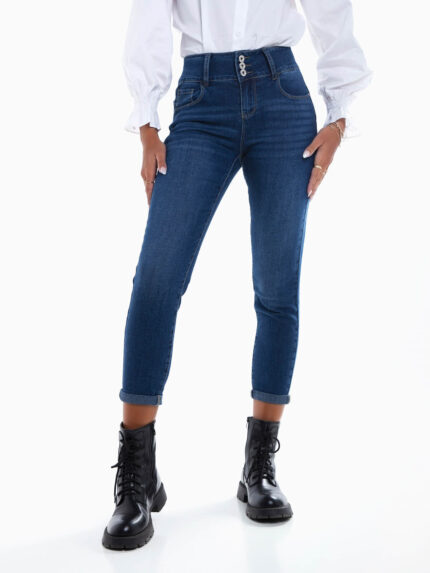 Straight jeans com efeito push-up para senhora. Calças ganga elásticas de cintura alta lavagem azul escuro. 5 bolsos. Aperto de fecho éclair e botão.