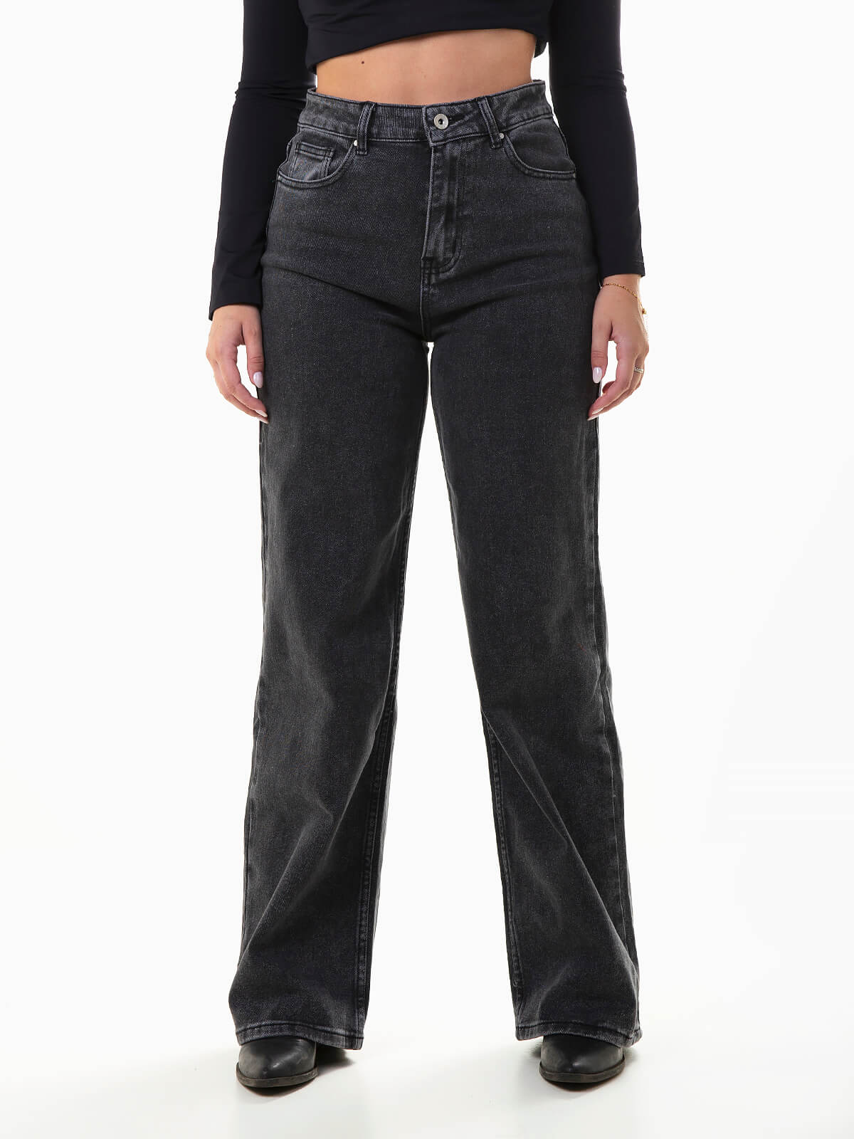 Straight jeans pretas para senhora. Calças ganga wide fit de cintura alta com 5 bolsos. Aperto fecho éclair e botão.