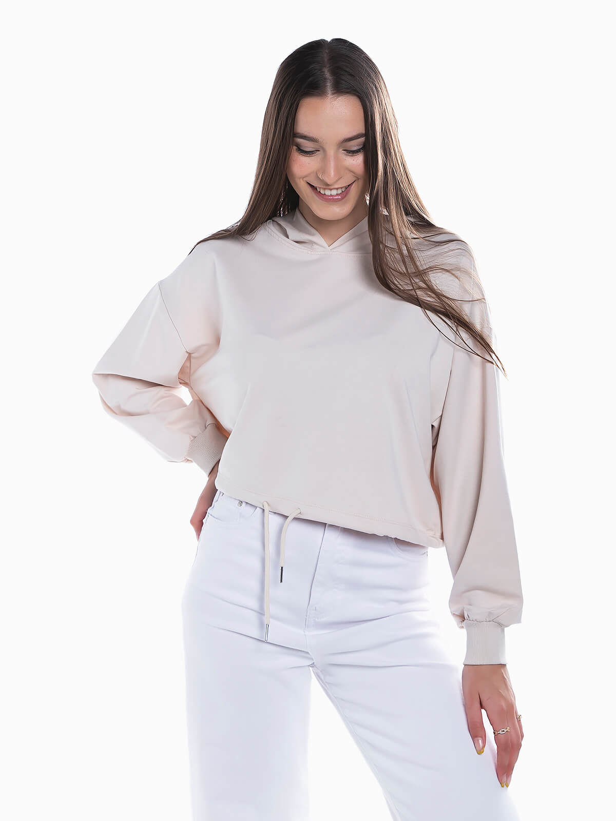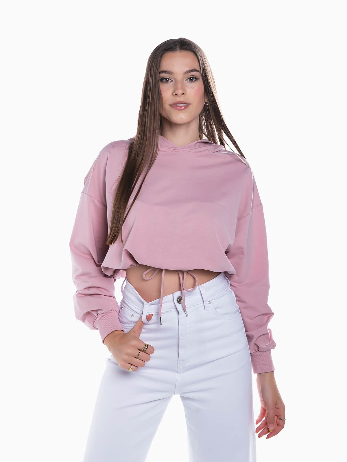 Sweater curta com capuz. Camisola manga comprida com elástico e cordão em baixo. Punhos elásticos.